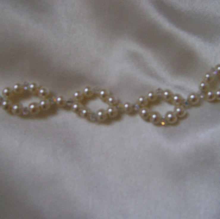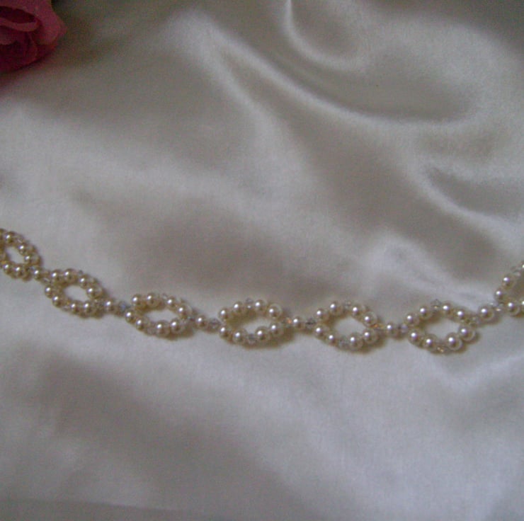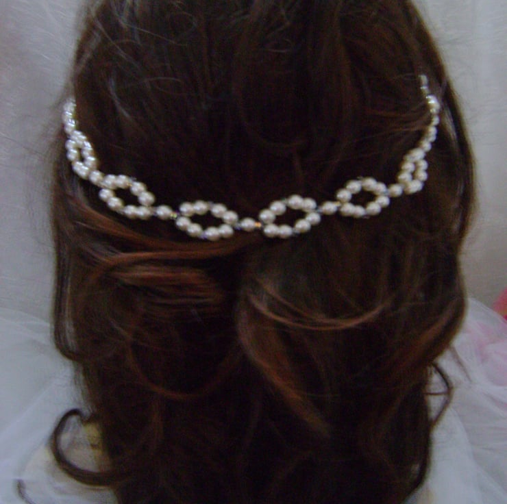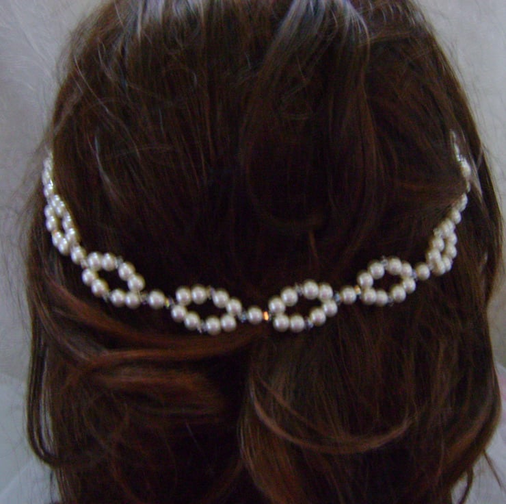 A Sophisticated and very pretty alternative to a tiara. This hair vine is handmade with a choice of ivory or white glass Pearls and sparkling Swarovski Crystals, and is approx 12.5" / 32cm in length. It is a flexible vine so it can be shaped to suit any bridal hair style, and can be fixed anywhere just by pinning it in place using the end loops, and kirby grips or pins.