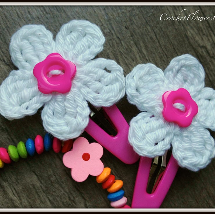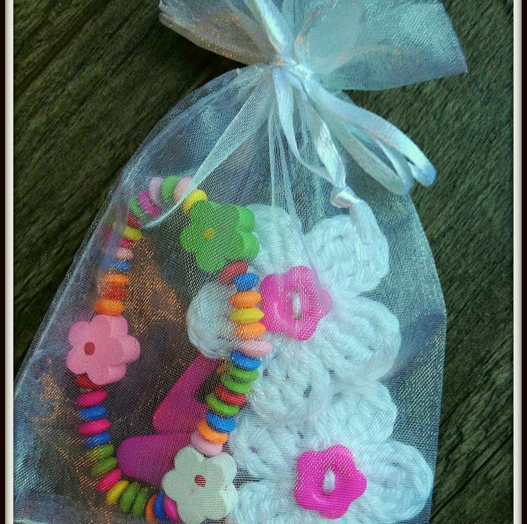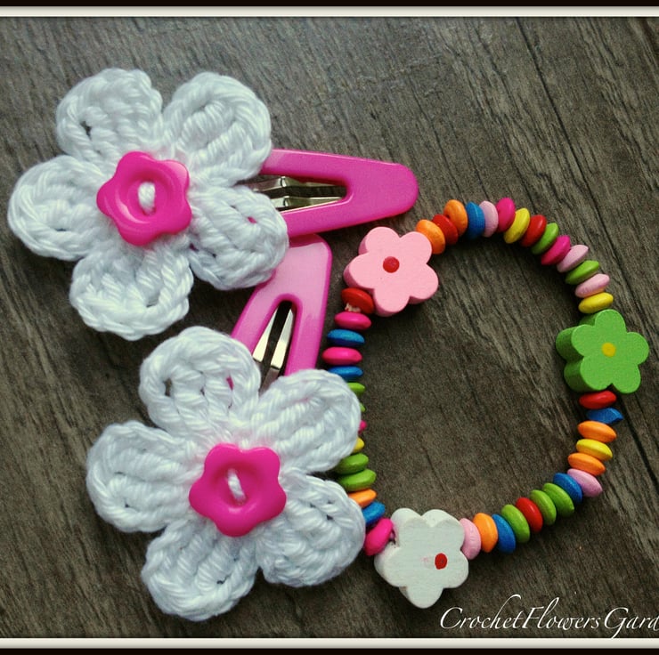 Cute gift set of 2 crochet flowers hair clips, and a lovelywooden bracelet- all in jolly colours and designs! Come to you packed in gentle organza bag- a ready present for a little princess!
