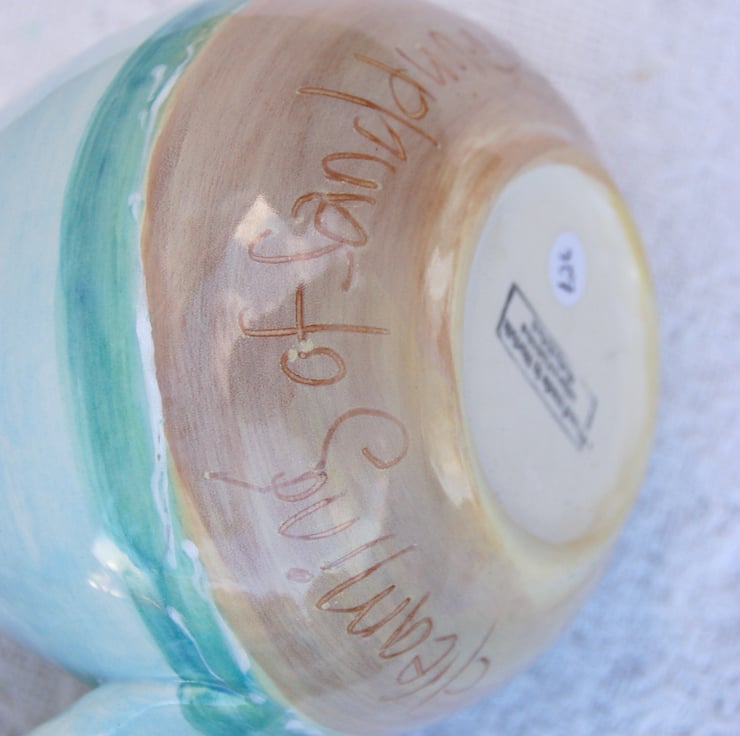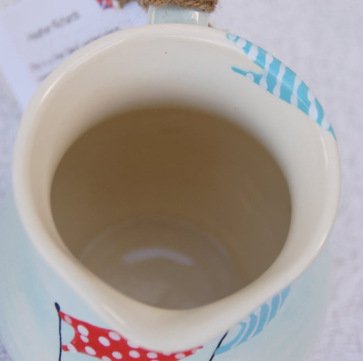 This is a hand painted individual jug with sea scape rolling round the whole jug, the paint strokes can be felt through glaze and the flags whip up and over the lip of the jug. I paint using food safe underglaze colour and fire to earthenware temperature using lead free glaze.