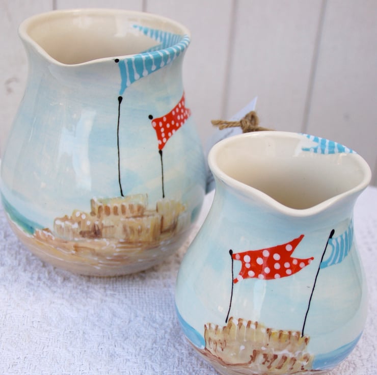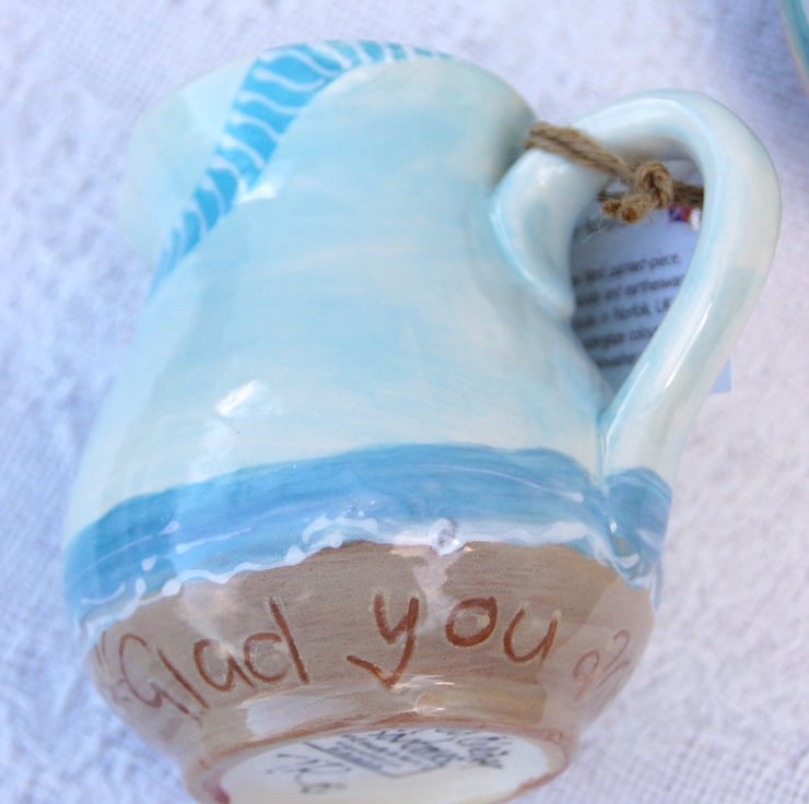 This jug is a 1/2 litre jug - ideal for water or juice on the table - or for flowers! 14 cm or 5.5" high, the message in the sand is ' Glad you are here' with a heart struck through with an arrow.. The larger jug in these photos is litre ...The sandcastles flags flick up and over the top rim of the jug.