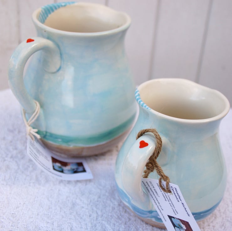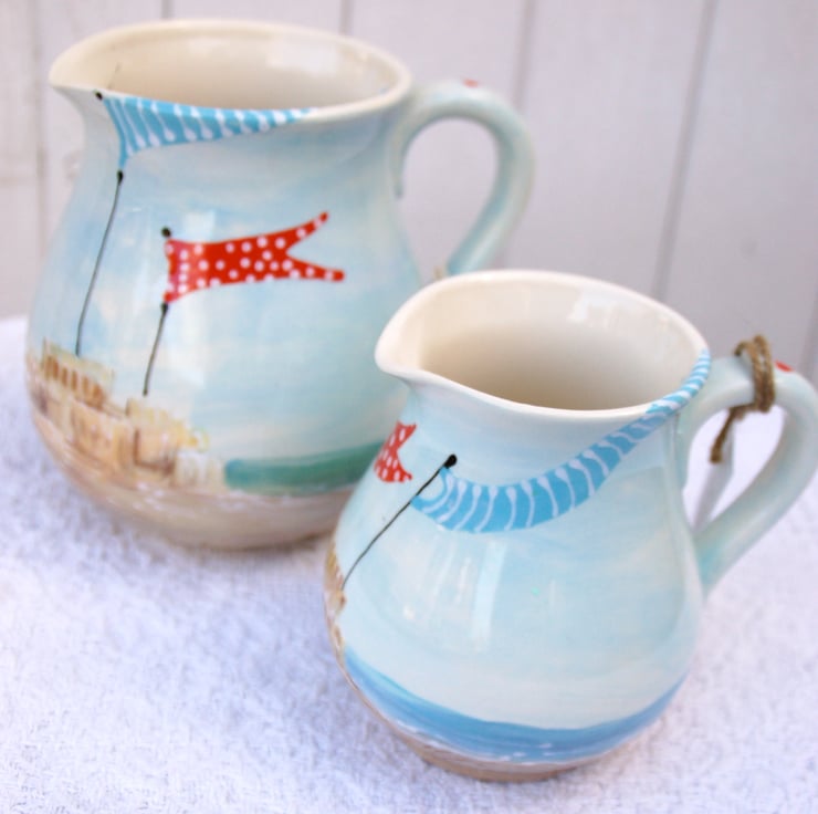 This is a hand painted individual jug with sea scape rolling round the whole jug, the paint strokes can be felt through glaze and the flags whip up and over the lip of the jug. I paint using food safe underglaze colour and fire to earthenware temperature using lead free glaze.