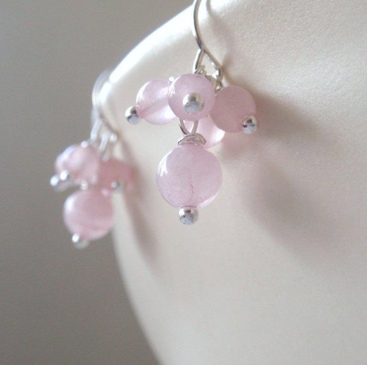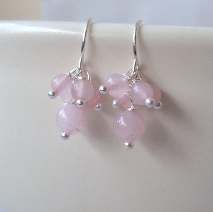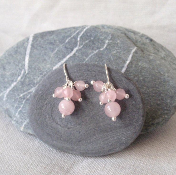 Lovely rose quartz cluster earrings with 6 and 4mm gemstone beads. Come on a silver plated hook.