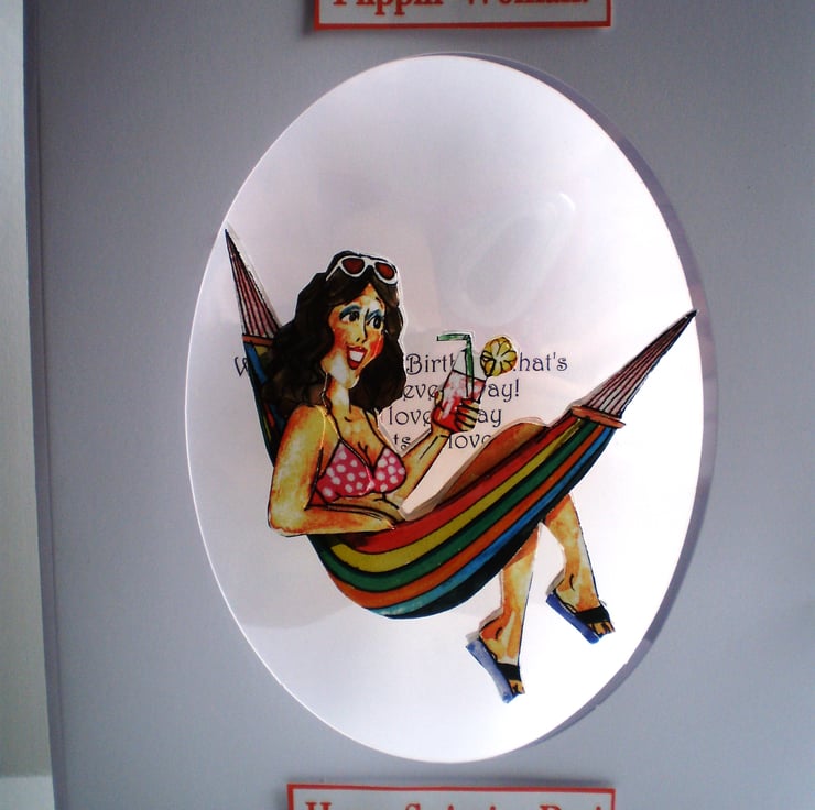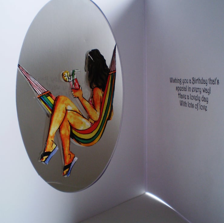 This large card is 210x250mm (8.8x10in). It has an oval aperture with acetate so that when you look inside card there is a back view. Inside is a verse on a white insert.