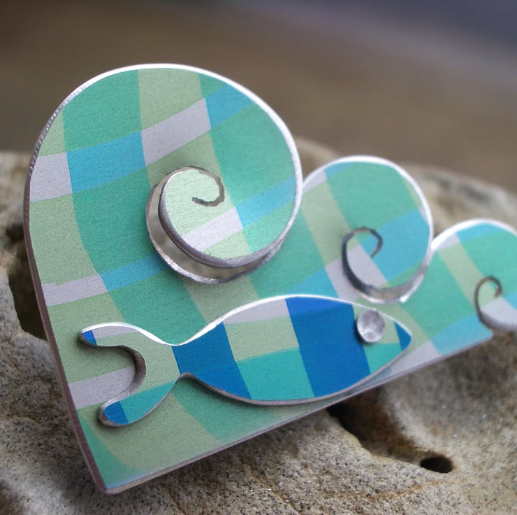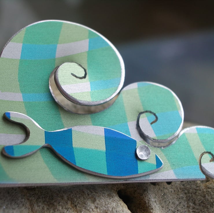 This whimsical little brooch is made from aluminium which I have dyed in lovely sea greens and blues, I then seal the dye so that it becomes a permanent part of the metal. The waves have been cut out by hand using a piercing saw and filed at the edges so that the waves have a silvery edge to them. The little fish has also been saw pierced and then riveted on using a hand made rivet. The brooch fastening is attached to the back of the brooch and is made from stainless steel.