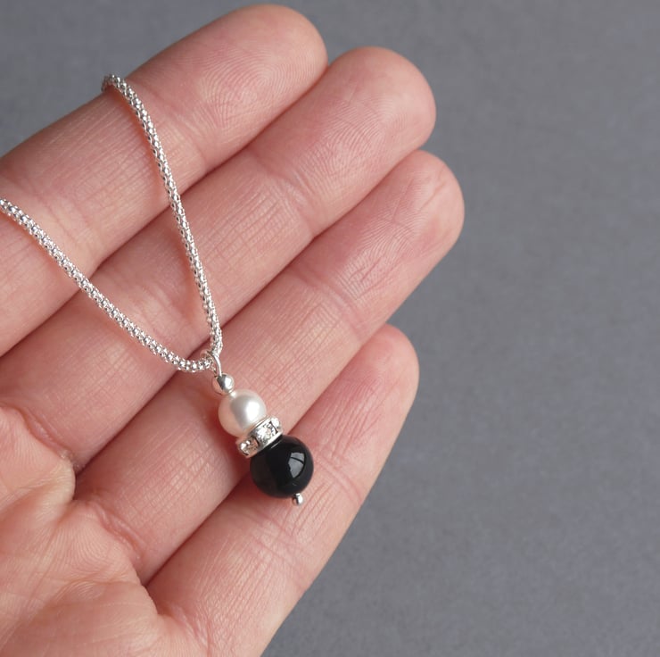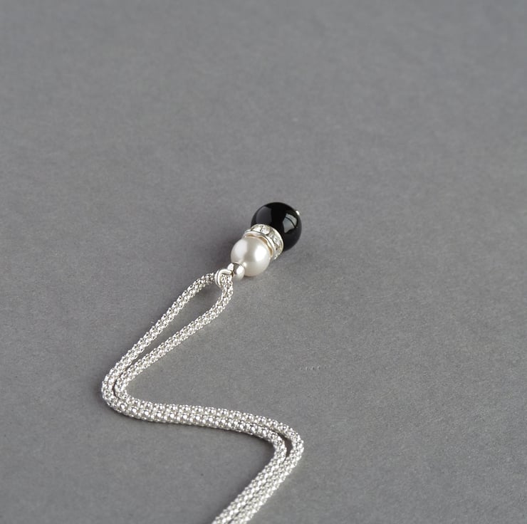 Simple and elegant in design, this jet black necklace would be ideal for bridesmaids in a monochrome themed wedding. A lone, white, glass pearl sits in a crystallised band above a single, jet black, onyx bead. The lustre of the pearls combined with the sparkle of the Swarovski crystals makes for a gorgeous elegant piece.