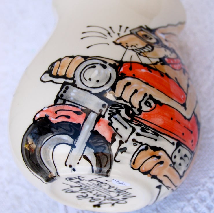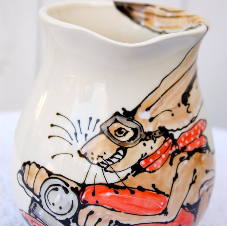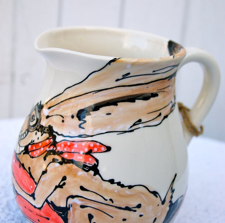 Ears flapping up and over the rim of the jug, red spotty neck chief flying out behind this hare is born to be slightly frivolous....This one has a huge fly catching grin!