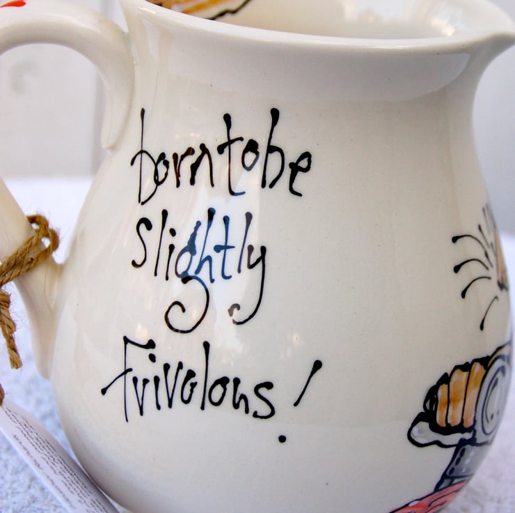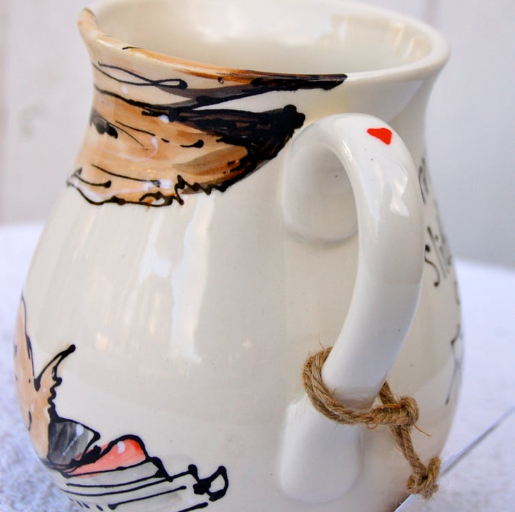 Painted in food safe earthenware underglazes and glazed in lead free earthenware, this jug is a great shape for juice or water on the table...when we have a house full we use this size for custard.