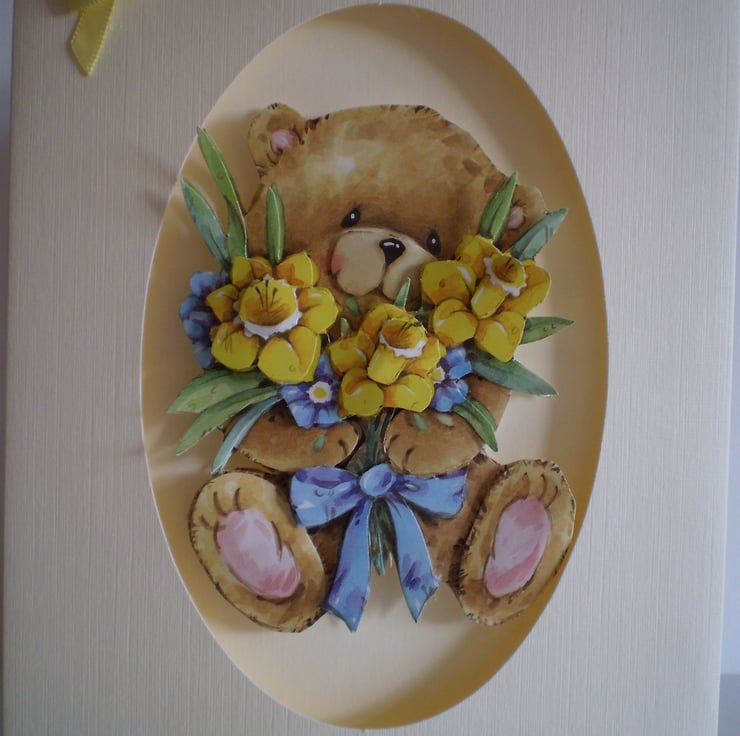 A decoupage 3D effect cream card of a cute teddy holding a bunch of daffodils. The card has an oval aperture and a yellow bow in corner. There is no greeting on this card but can add one if you prefer. Measurements are 150x203mm (6x8in)