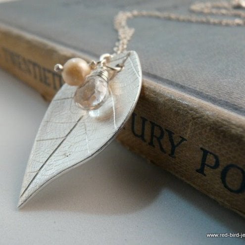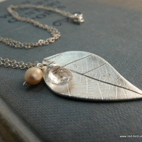 A sterling silver chain of 18 inches holds a handcrafted fine silver leaf, with leaf texture detailing. I have added a freshwater pearl with a very subtle pinkish sheen and gorgeous facetted rock crystal.