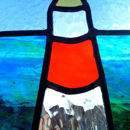 This is a design from my Devon Coastline series and is made using traditional leading techniques. Some of the glass is recycled from waste and I have used some lovely streaky glass to depict the sea.