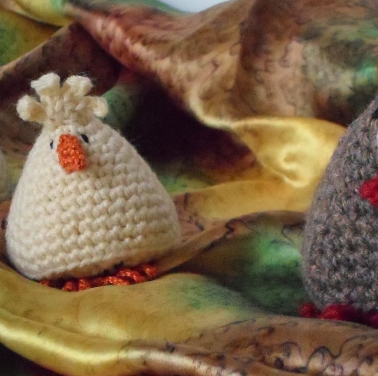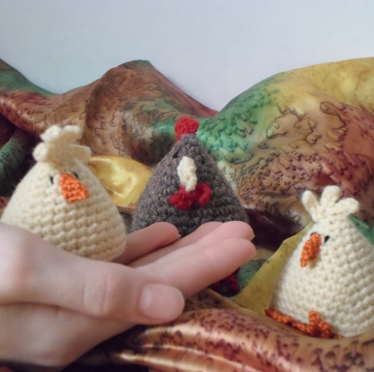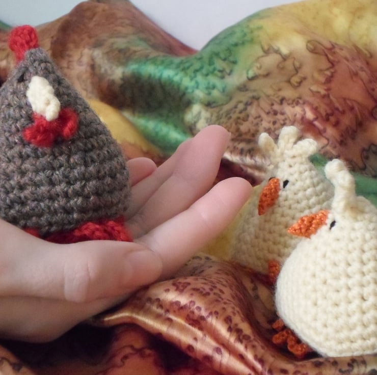 Made in mixed fibres the hen is approx 6 1/2 cm high and the chicks are approx 5 1/2 cm.