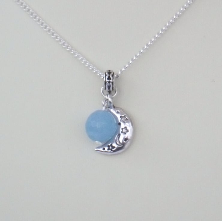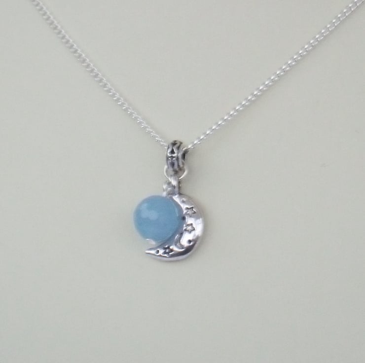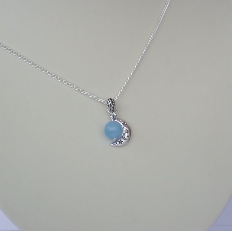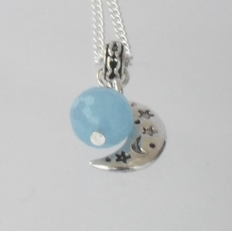 Beautifully coloured and faceted blue quartz is hung with a crescent-shaped moon charm, made from tibetan silver.