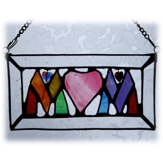 The suncatcher hangs from a little chain which is securely attached at either side of the top of the suncatcher. It is 14cm long and 7 cm high.