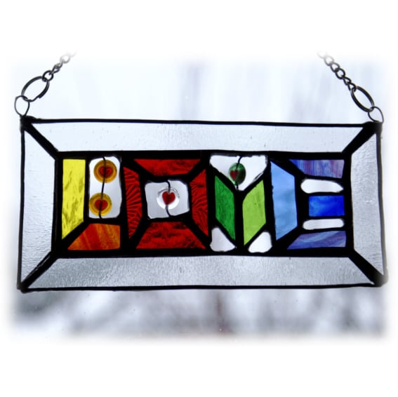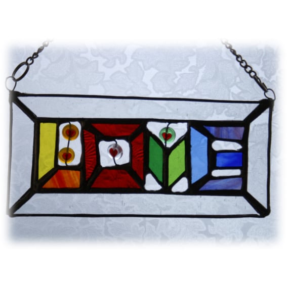 The design is a plaque spelling LOVE using lovely textured glass in all the 7 bright colours of the rainbow but with emphasis on vivid shiny red. Mixed in with the letters are colour coordinated round beads with red hearts in the centre. The ‘Love’ is then framed with clear glass with a gentle texture.