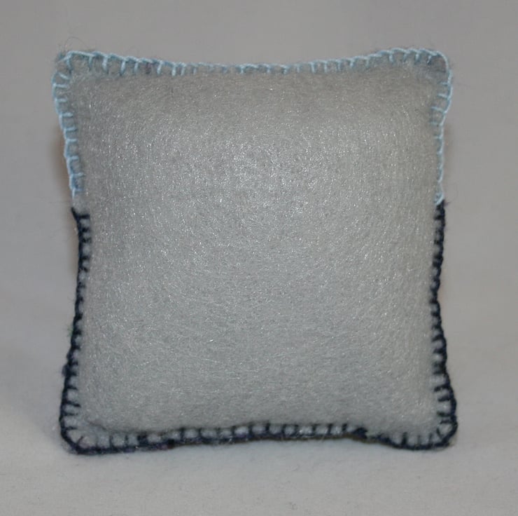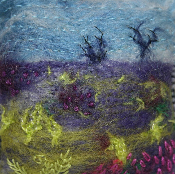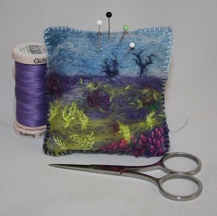 Sky blue wool fibers have been felted to a background of kunin felt (produced from recycled plastic bottles). Fibers, in shades of heather and lime green, have been added to represent the moor. Snips of wool and 'teased out' snippets, have been felted in place to represent distant trees and new bracken fronds. Stitching in fine cotton has been added to the sky to 'stabilise' the felting. Ferns and heathers, in the foreground, have been embroidered in simple stitches using cotton threads. French knots represent distant clumps of heather. The pincushion is edged in blanket stitch using threads to match the areas of the design.