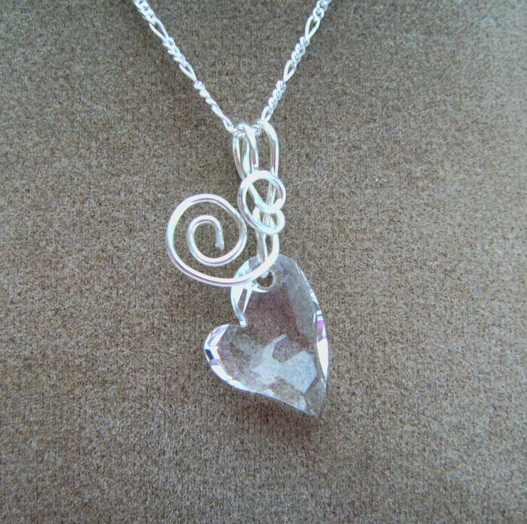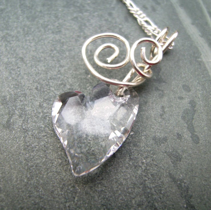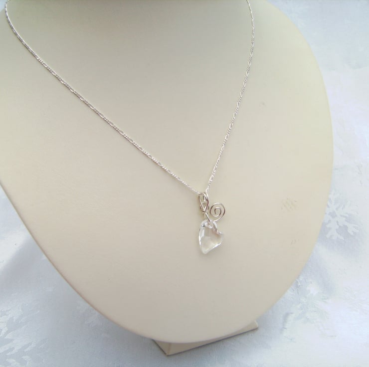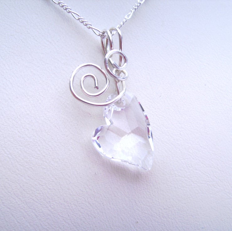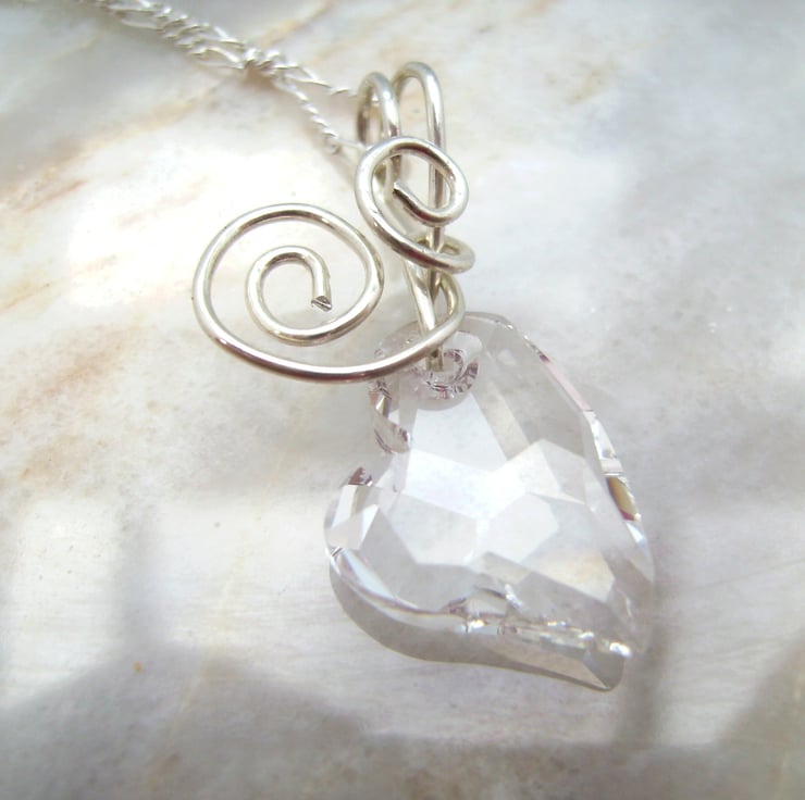 This lovely valentine pendant necklace has been created using a clear faceted swarovski crystal heart ( which is approximately 1.5cm by 1.2cm) with sterling silver wire wrapped in spiral form & hung on a 17.5 inch sterling silver chain.