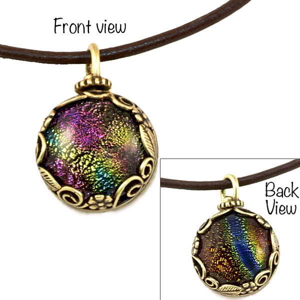 A small 16mm pendant which is set with two handmade dichroic glass cabochons. The pendant revolves so either side can be shown. On one side the colours are predominantly orange/blue and the other pink/green which twinkle as the light catches.