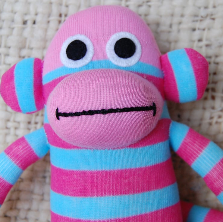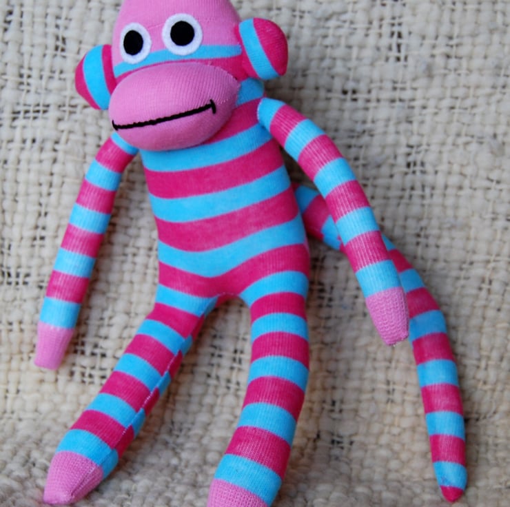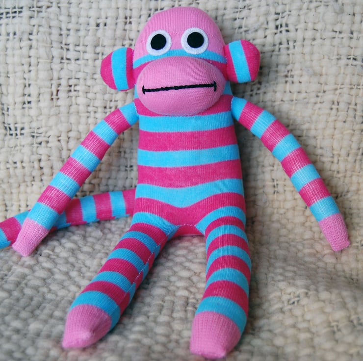 Jools is a cute soft monkey toy made from a brand new pair of socks and filled with polyester fibrefill conforming to EN71. All monkeys are now CE marked and comply with European standards. Monkey's eyes are made from wool felt and are securely stitched to toy.