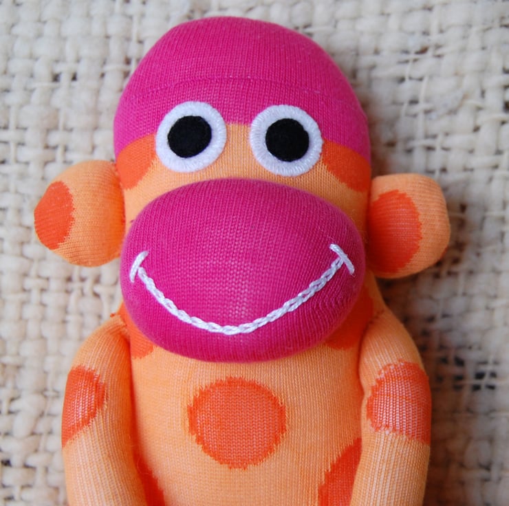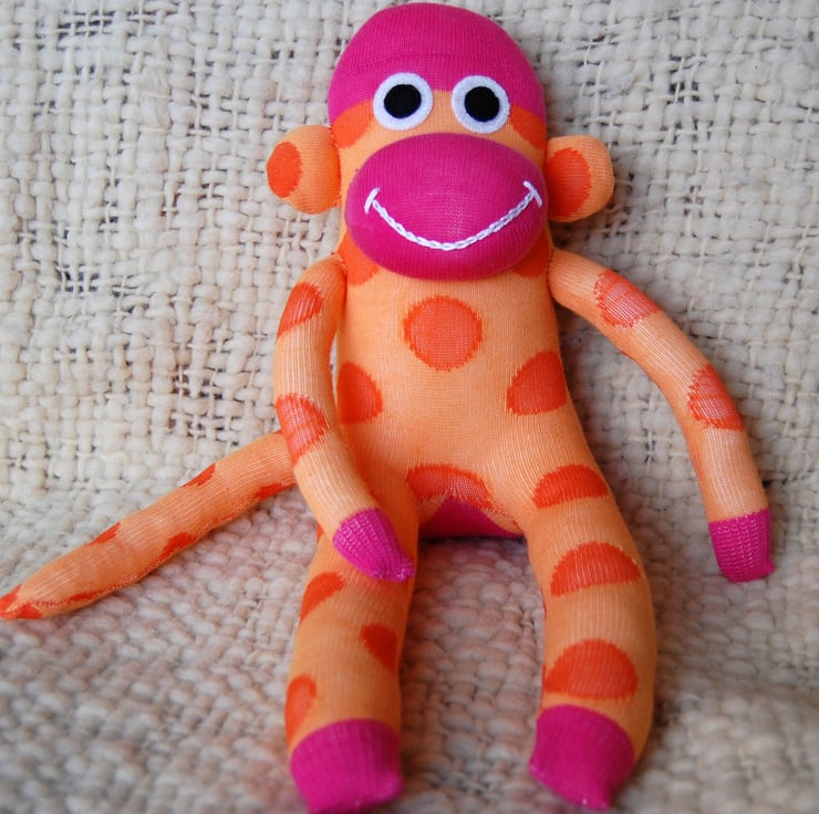 Banjo is a soft, cuddly monkey toy made from a brand new pair of socks and filled with polyester fibrefill conforming to EN71. All monkeys are now CE marked and comply with European standards. Monkey's eyes are made from wool felt and are securely stitched to toy.