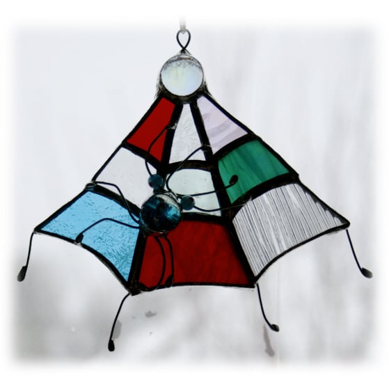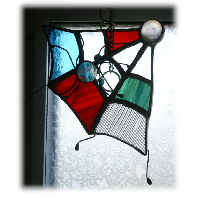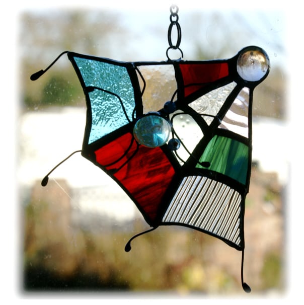 All 9 sections oft the web are different types of glass, 5 clear but textured and 2 each in reds and bright turquoise. I've used some iridescent glass to give it extra shine.