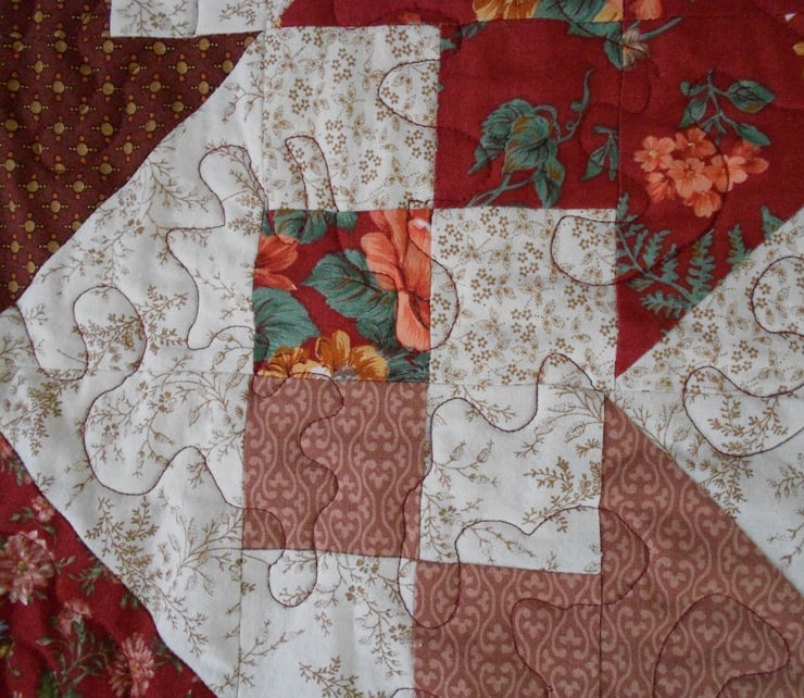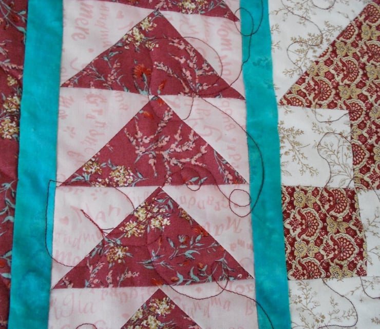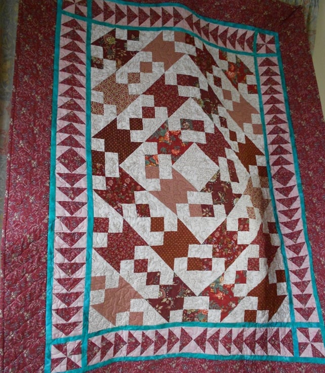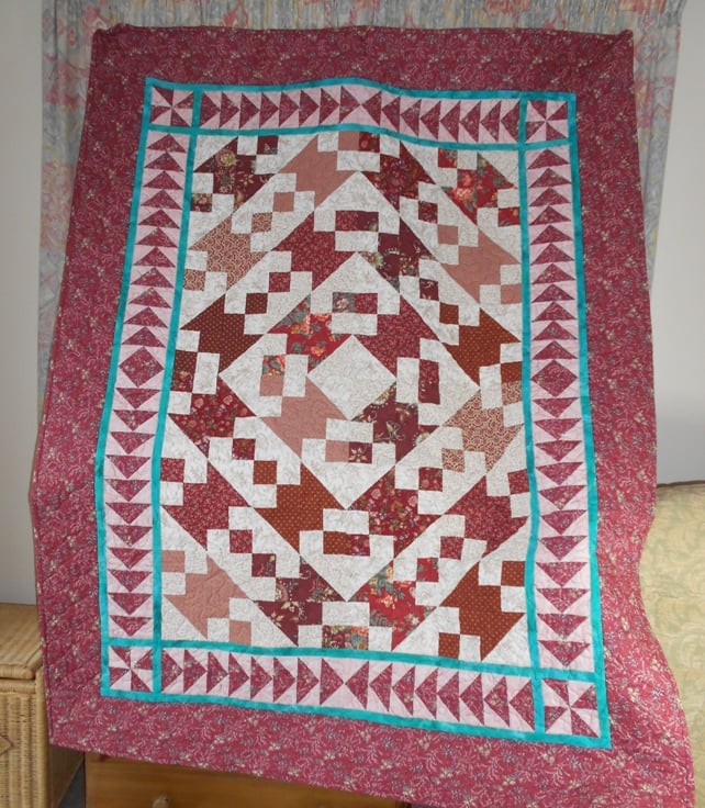 This quilt has been a long time in the making! The central section is pieced using 24 'Northern Lights' quilt blocks arranged to give the radiating diamond design. A border of 'Flying Geese' triangles surrounds the centre with a 'Pinwheel' block in each corner. I have used different machine quilt designs for the centre and two borders.