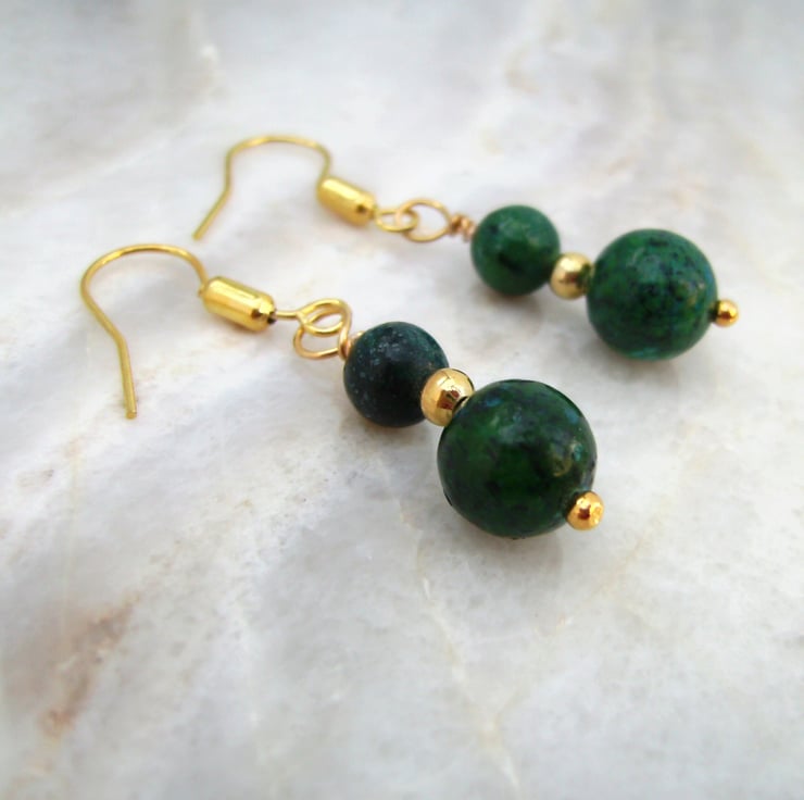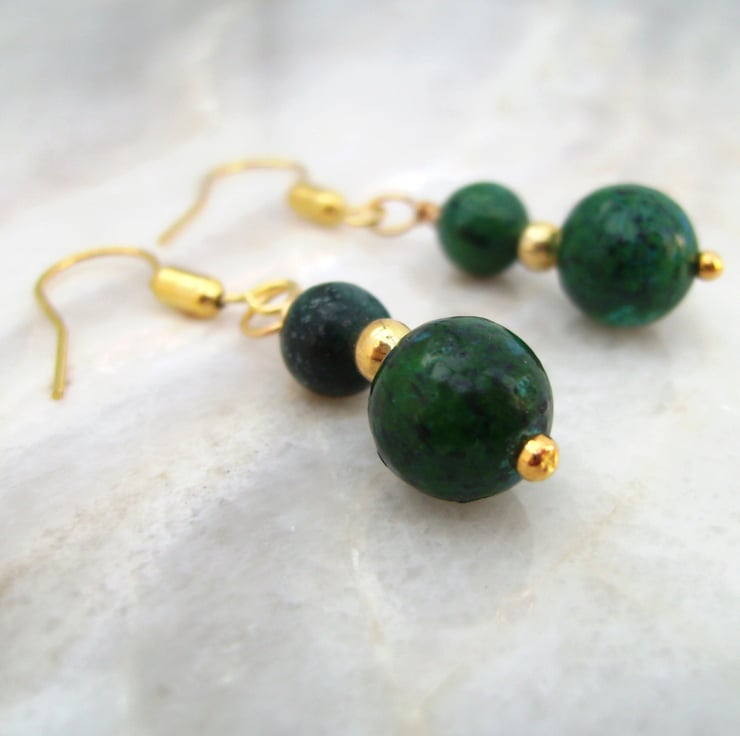 This pair of earrings have been handcrafted using 6mm & 8mm chrysocolla semiprecious gemstone beads with gold plated beads & wire, hung on gold plated ear hooks.