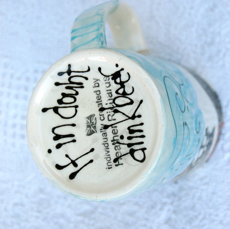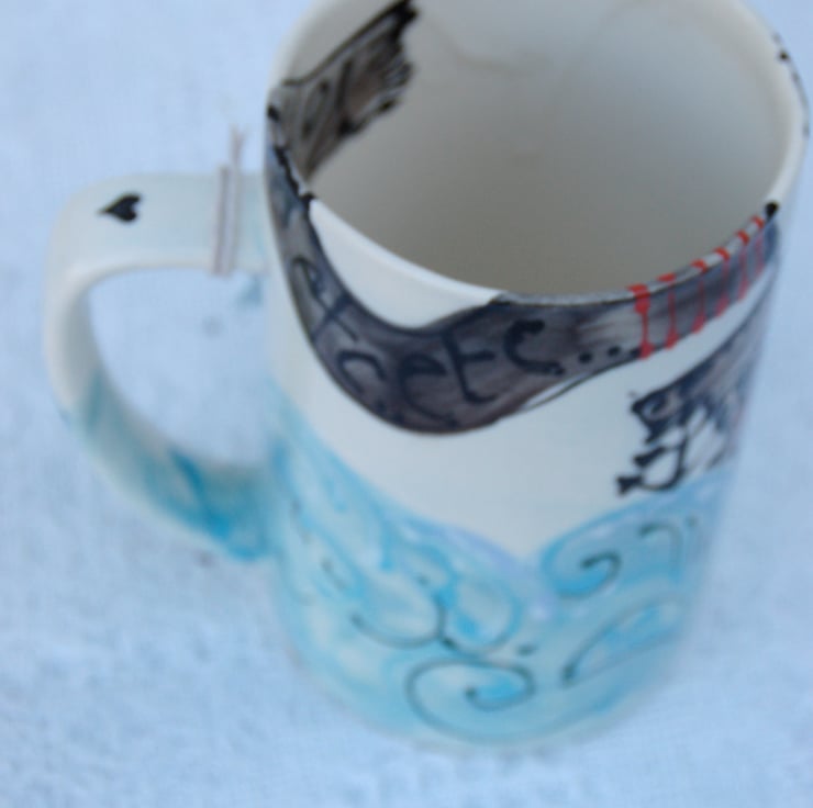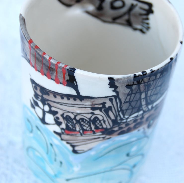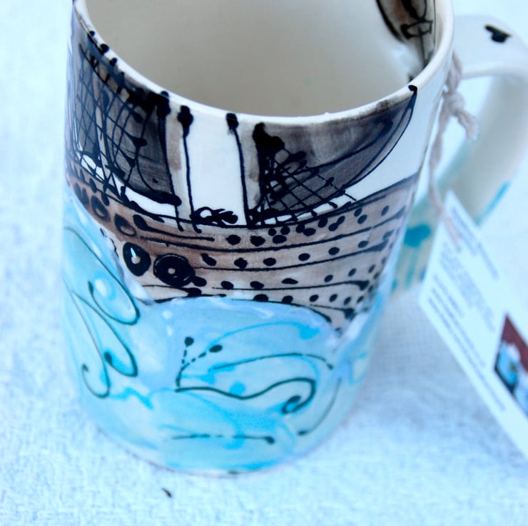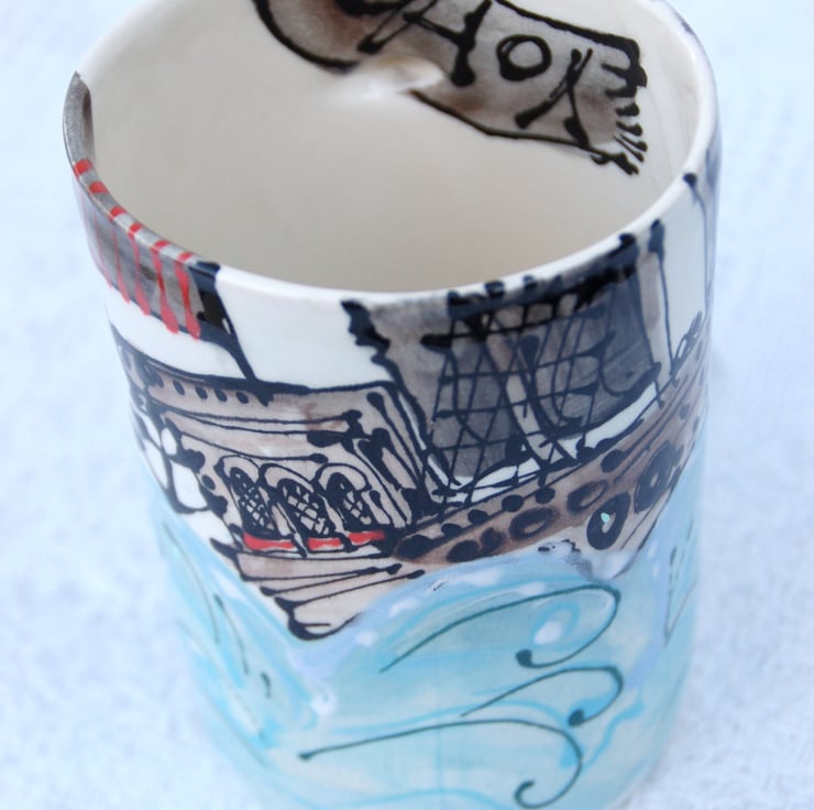 this is a hand cast vessel, free hand painted with a rickey pirating ship the Yo ho ho flag flicks up and over the top of the mug and there is a black heart on the handle. i hand paint each piece individually and you can feel the brush marks under the glaze. i use food safe underglaze colours and lead free glaze. this is an earthen ware piece and can be dishwashed but not recommended for the microwave.