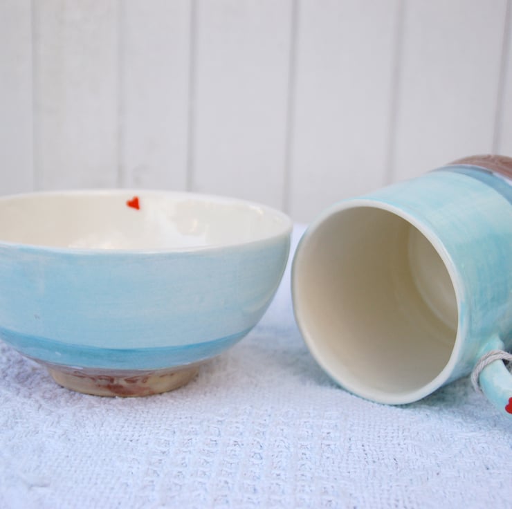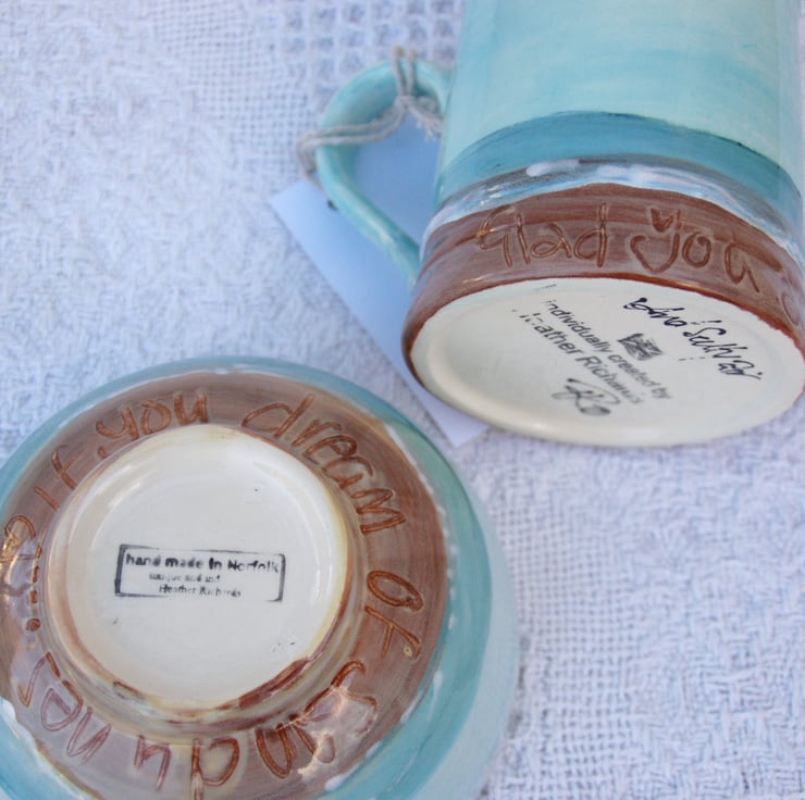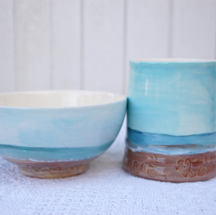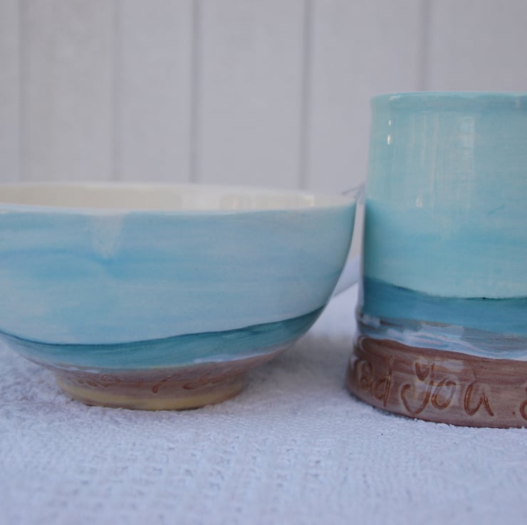 A hand cast 3/4 pint mug and a breakfast bowl painted together in the same beach design with writing in the sand "If you dream of sand dunes" The design is individually painted onto each vessel and is not a transfer or a print. The message in the sand can be made according to your wishes, bespoke items would take 14 days to complete. This is ready for dispatch
