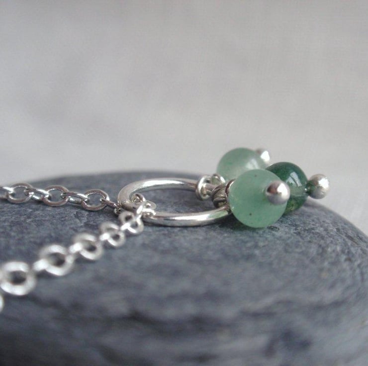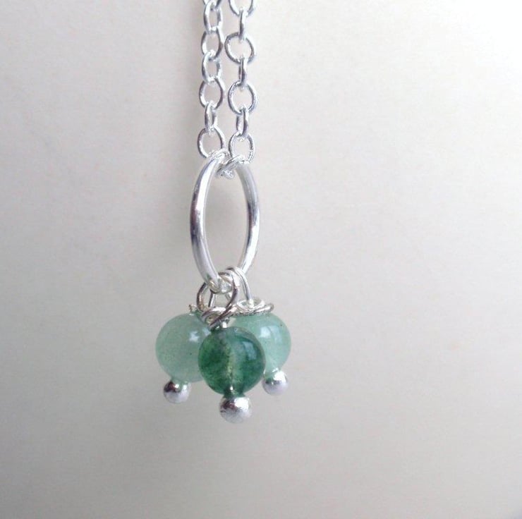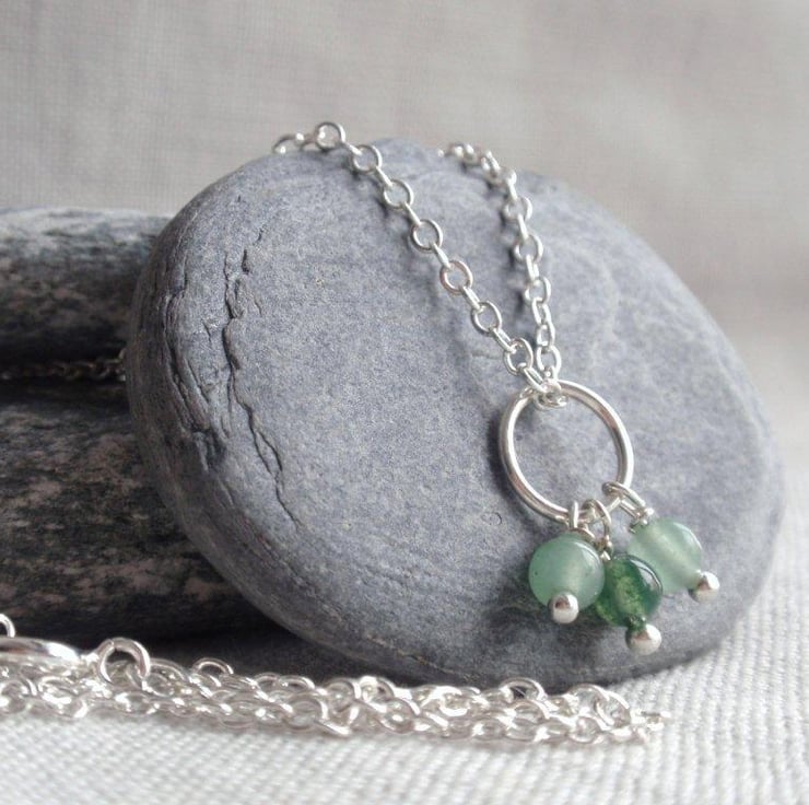 Moss agate and aventurine green pendant necklace with three gemstone beads, 4mm on a silver plated 1cm hoop and silver plated chain, 18inches.