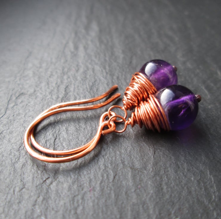 These elegant purple amethyst earrings are sure to become an essential addition to your wardrobe. Each stone has been lovingly wrapped in copper wire to create a beautiful teardrop shape before hanging from handcrafted ear hooks. Their simple, delicate design gives a timeless appeal that will mean you can wear them time and time again, day or evening. They would make the perfect gift for collectors of semi-precious stones or admirers of handmade designs.