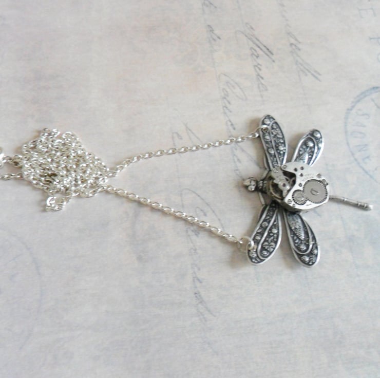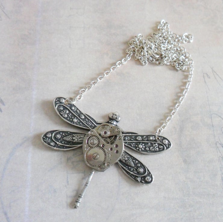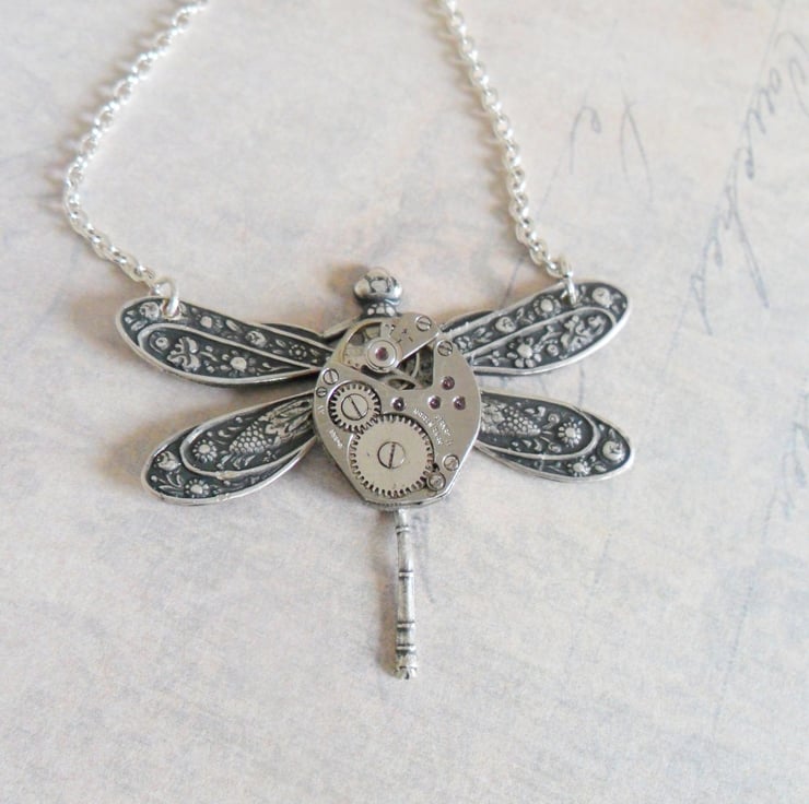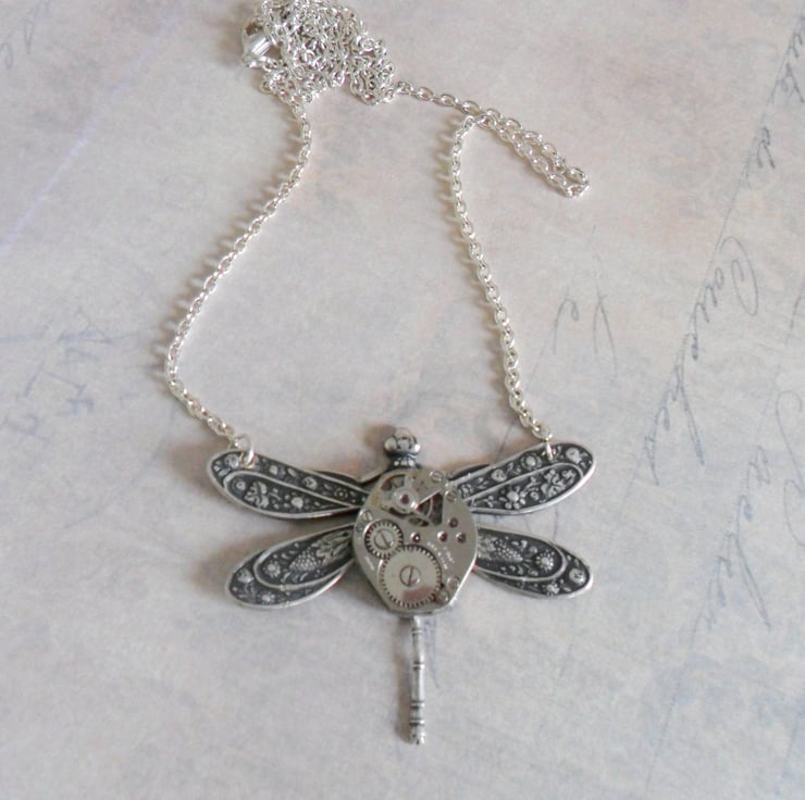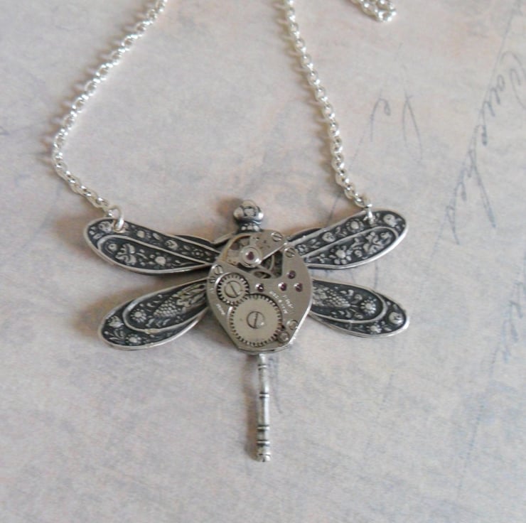 I created this Steampunk style necklace by combining the a whimsical detailed antiqued silvertone Dragonfly, with the industrial chic of a vintage watch movement.... two methods of movement in harmony.