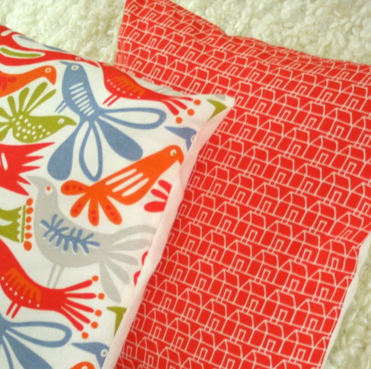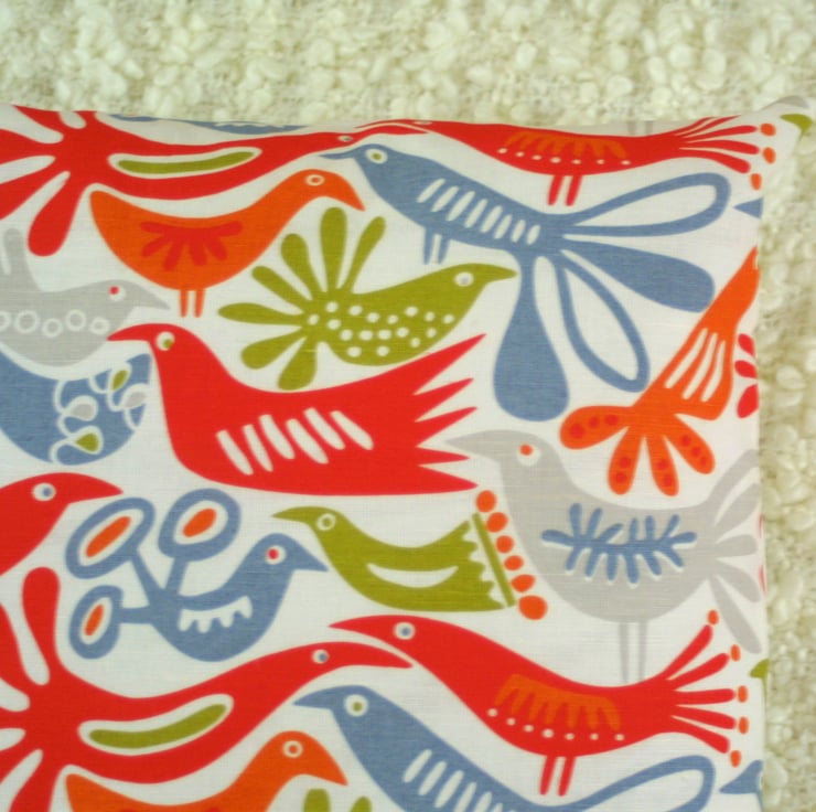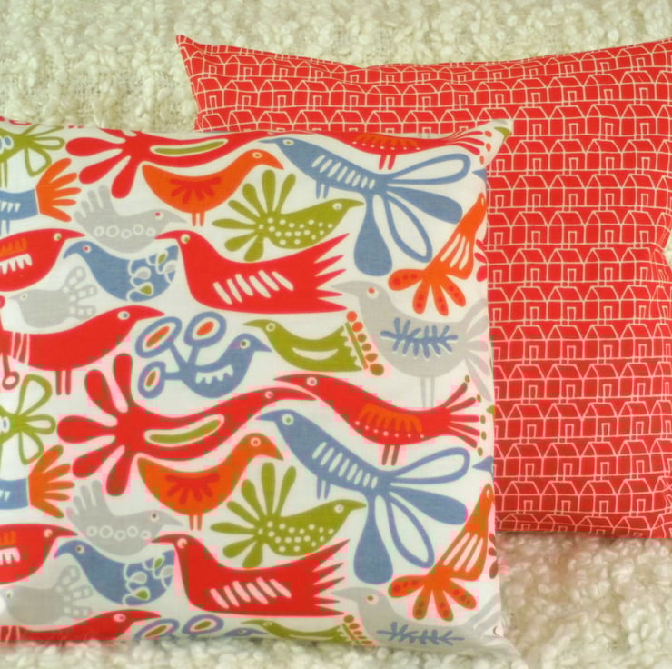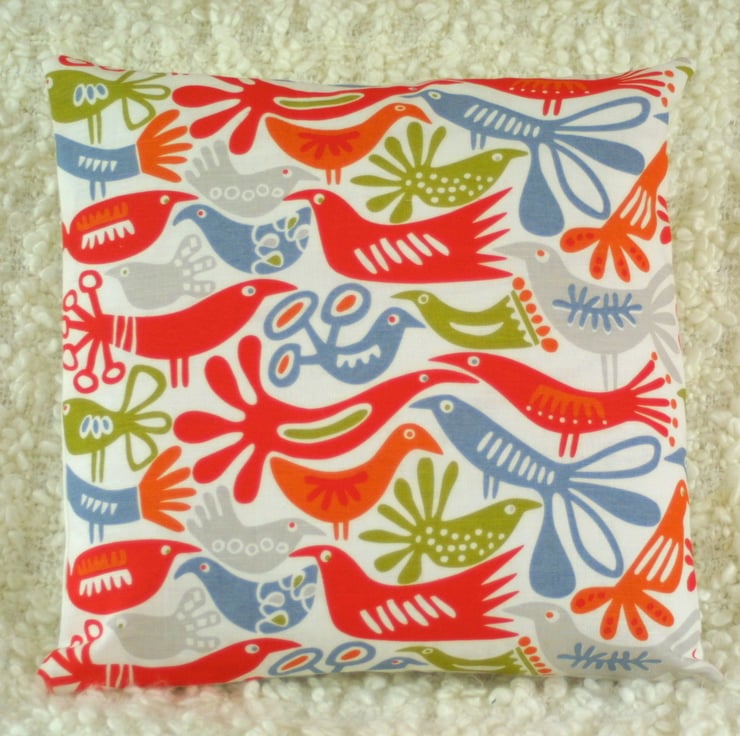 Handmade in a beautiful birds print fabric from Sweden, this cushion cover measures 40 x 40cm and is backed in white linen look cotton. It closes with two mother of pearl buttons.