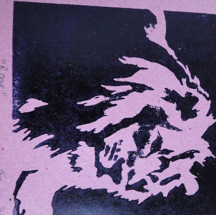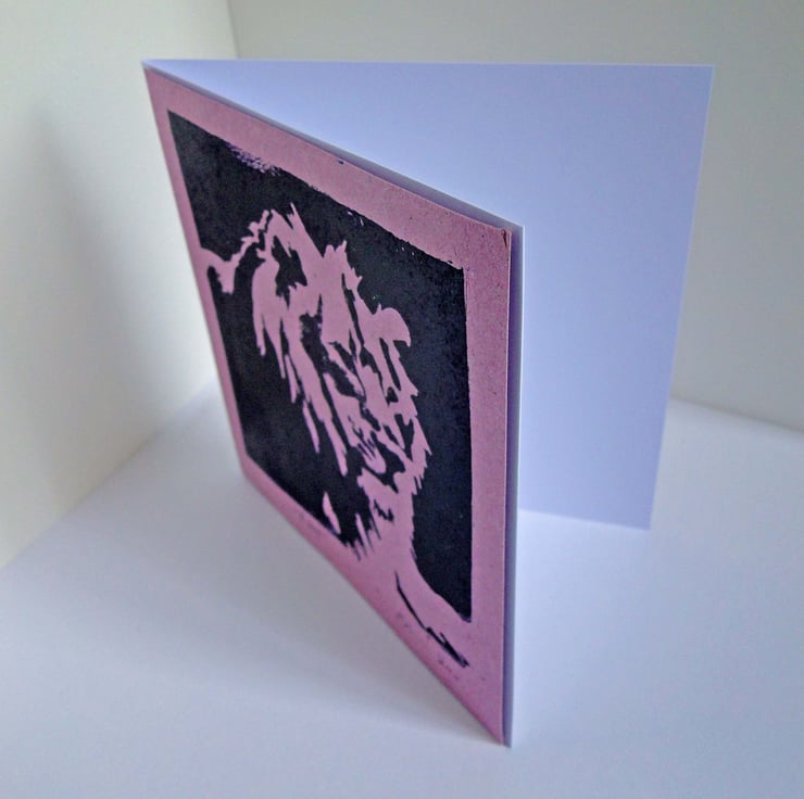 Blank inside. Hand printed on pink card mounted on a white blank card.