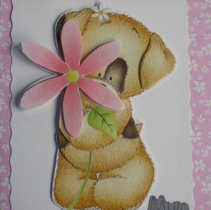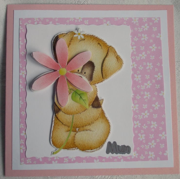 The base for this card is a soft pink card with a pearlised finish, onto this I've placed a layer of white card and then pink daisy patterned paper. The topper has been placed onto a layer of white card which I cut with a wavy edge, the image has been 3D decoupaged and I've placed a 'Mum' sticker to the bottom corner of the topper.