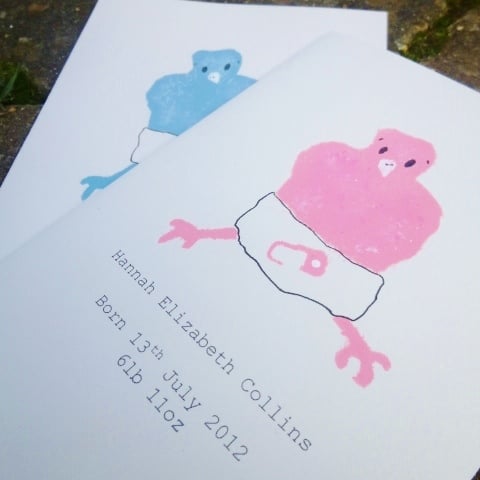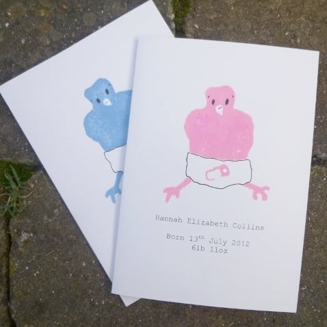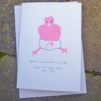 This personalised new baby card is an original design created with love and humour for that special new arrival, hand painted using stencilling. The personalised detail of the baby's name, date of birth and weight will be printed as shown. Please contact me if you'd like a different message - that is fine but please limit the text to 3 lines as in the sample.