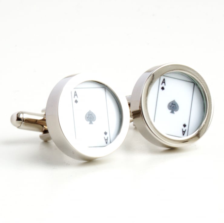 Cufflinks of the Ace of spades card, part of a range of playing card and poker cufflinks. The spade in these playing card cufflinks has a lovely ornate scroll design.