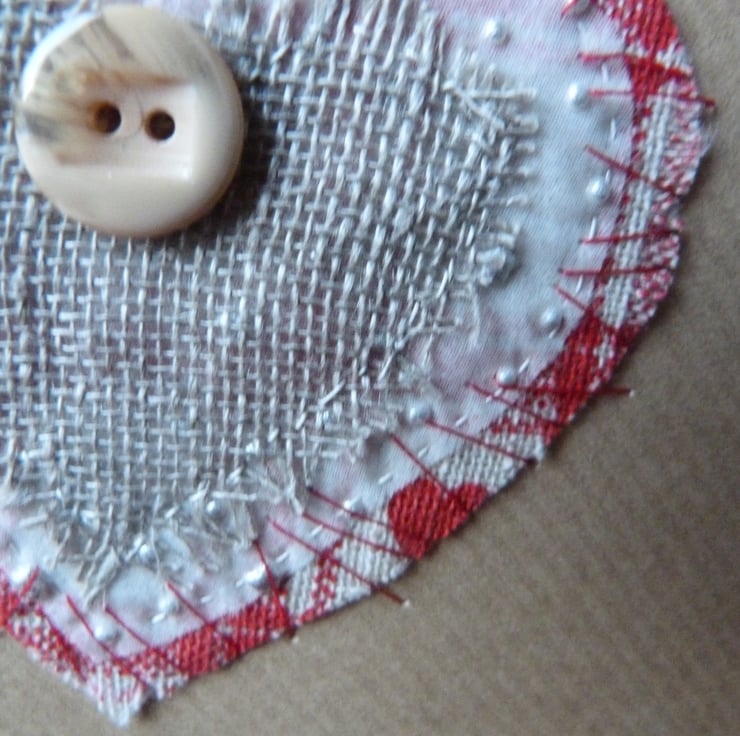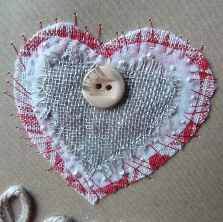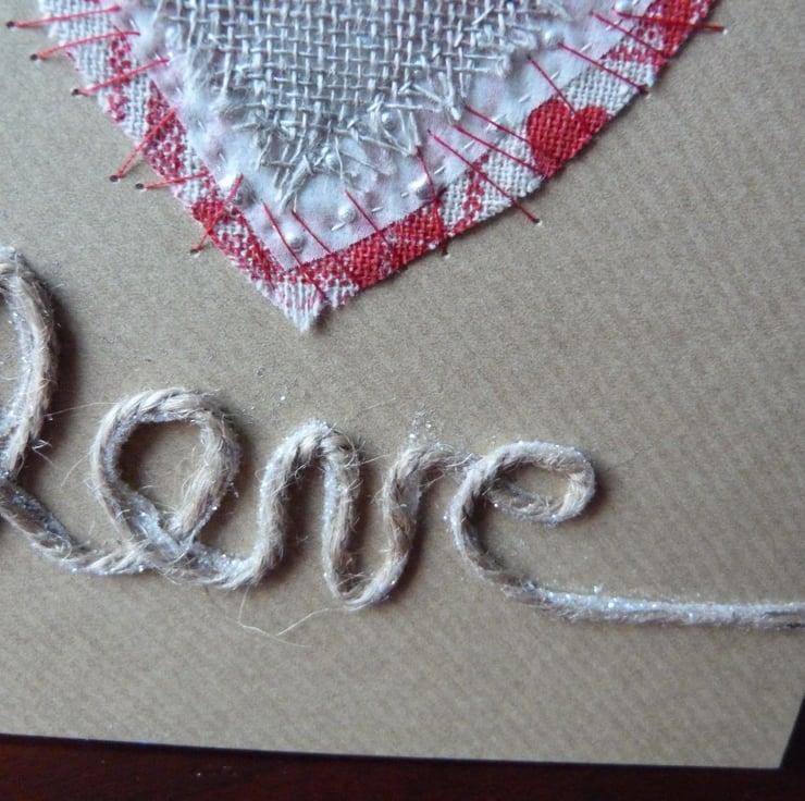 A series of graduated hearts made from scrim, chiffon and red heart printed hessian which have been handstitched together and then stitched with red thread onto quality brown paper look alike card. A piece of twine has been twirled to make the word love and has been decorated with fine silver glitter. Further embellished with a button.