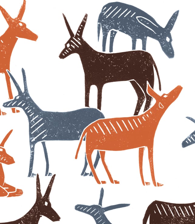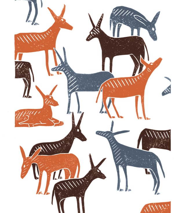 A3 (29.7cm x 42 cm) poster-print entitled 'Wandering Donkeys' printed in orange, brown and blue-grey.