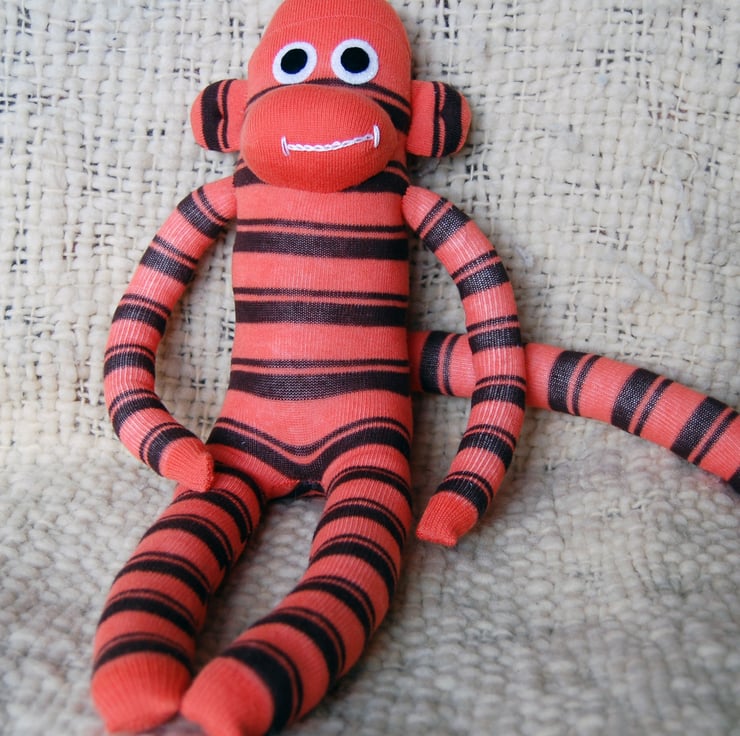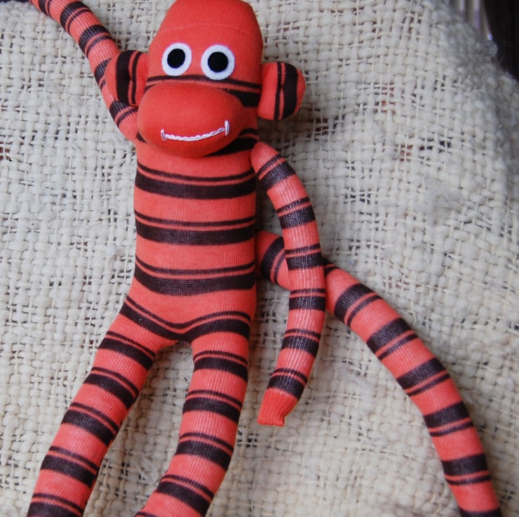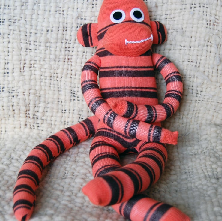 Digby is a fun soft monkey toy made from a brand new pair of socks and filled with polyester fibrefill conforming to EN71, CE marked and safe for babies, children and adults too!