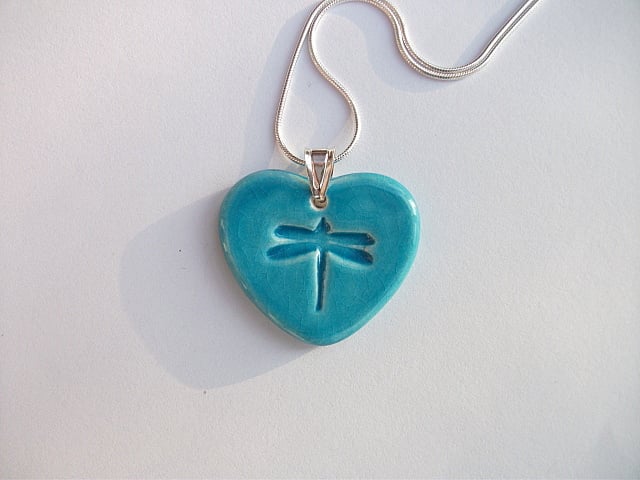 The ceramic heart has been impressed with a vintage printers die stamp, which I found at the wonderful Apple Market in Covent Garden. Glazed three times in a semi transparent turquoise glaze, hanging from a sterling silver pronged bail on a sterling silver 16 inch snake chain with lobster clasp.