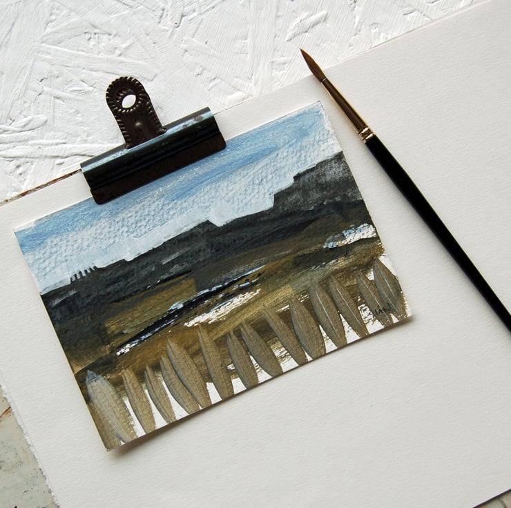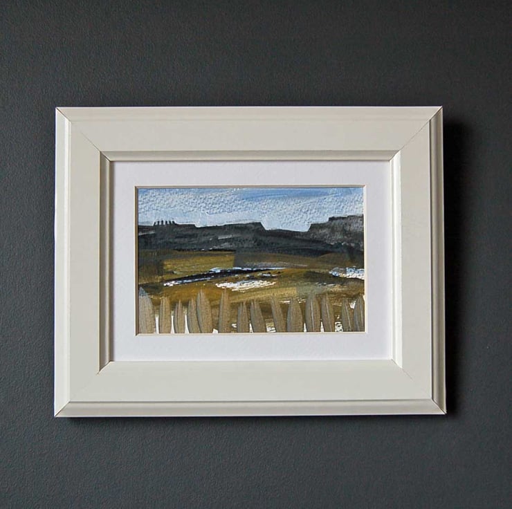 This is an original acrylic painting of an upland moorland landscape. Inspired by the Dark Peak area of the Peak District in Derbyshire on the fringes of Sheffield. There is (of course), a lovely gritstone escarpment looming moodily in the background. This area is world-renowned with climbers for it's gritstone edges including Burbage and Stanage, which are very popular for climbing and bouldering.