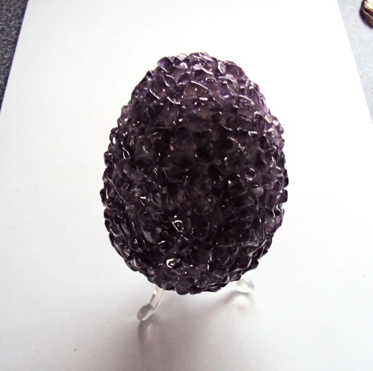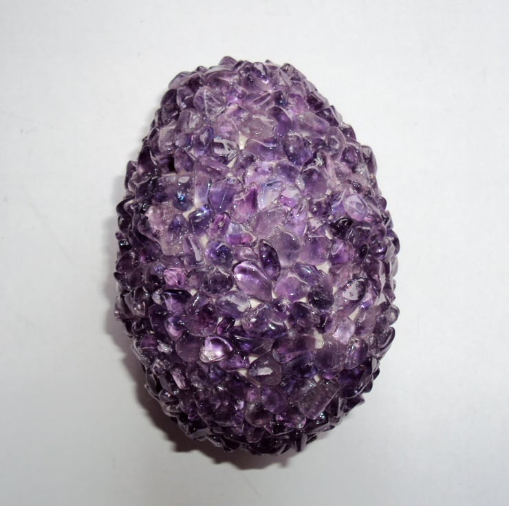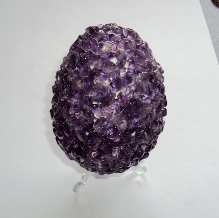 This is a real blown goose egg from my own geese that has been covered with tumbled amethyst gem chips.
