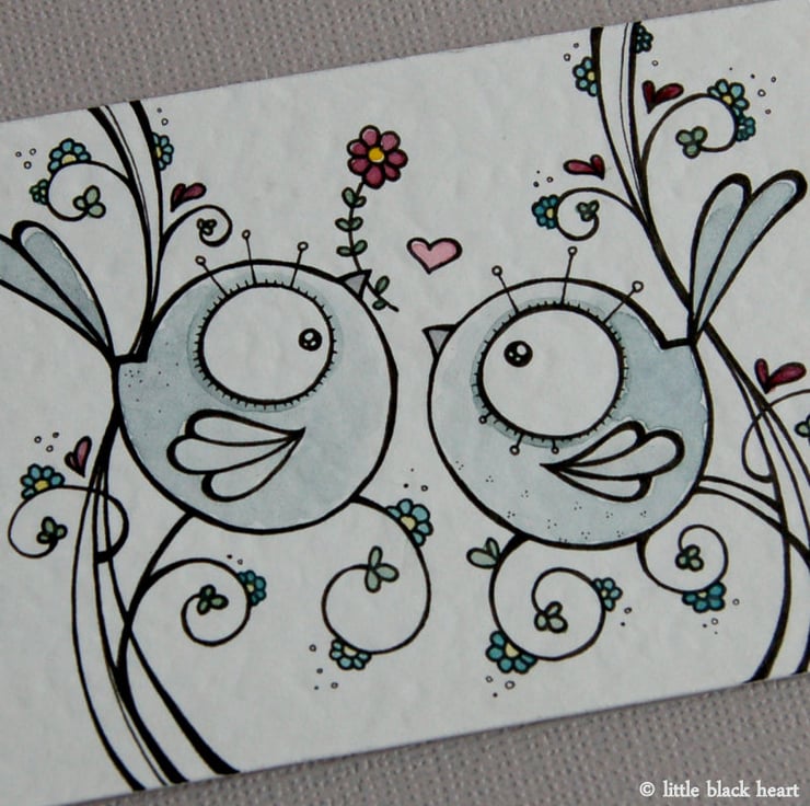 a sweet pair of romantic birds, surrounded by flowers and fancy swirls!