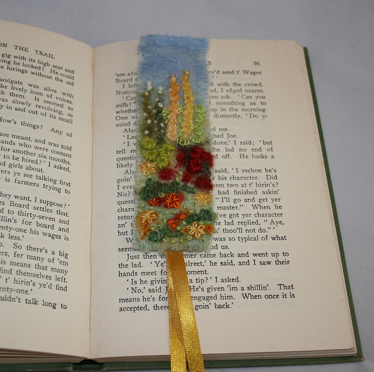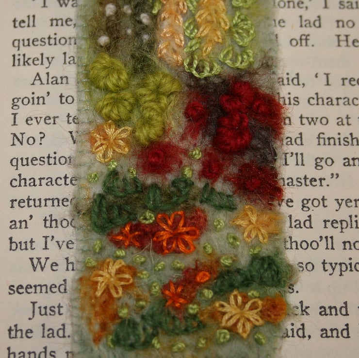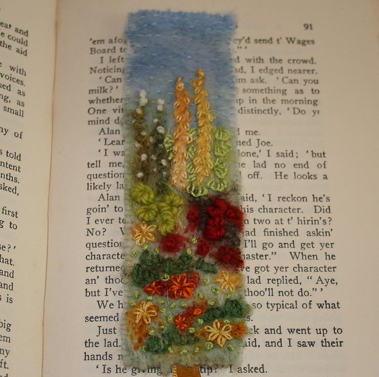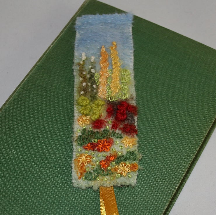 Sky blue wool fibers have been felted to a background of kunin felt (produced from recycled plastic bottles. Textured, hand-dyed wool tops, some of them with lovely curls, have been felted in clumps to represent the planting. Stitching in fine cotton has been added to the sky to 'stabilise' the felting. Simple embroidery stitches, in crewel, tapestry and knitting wools, have been used to create more foliage and the pretty flowers. The pincushion is edged in blanket stitch using threads to match the areas of the design.