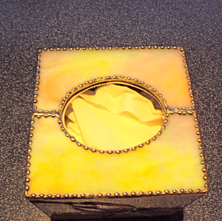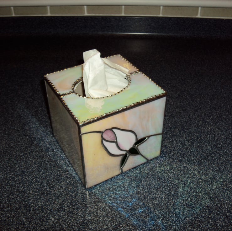This is a five sided stained glass box designed to conceal cube shaped tissue boxes that measure 120x120x115mm high . The cover slips over the box and has an oval cutout to lift the tissues from. The top edges and around the hole are decorated with solder beads.