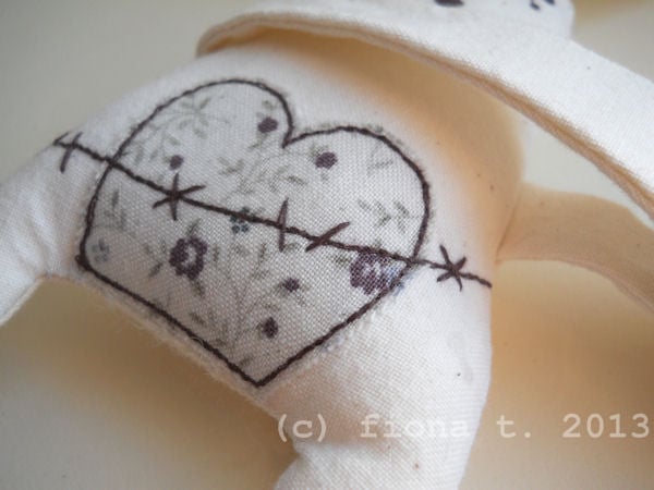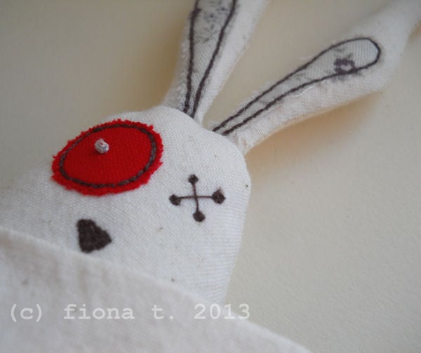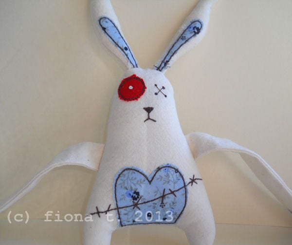 the printed cotton fabrics are appliqued onto pre-washed calico, and i then draw on the intricate details with free machine (free motion) embroidery, before making up the finished rabbit. their remaining eyeball is hand embroidered.