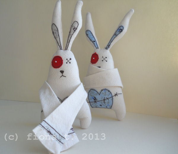based on original drawings by Little Black Heart, these zombie bunnies are entirely handmade by me on a domestic sewing machine. they measure approximately 17cm (7”) from the tips of their ears to their little zombie toes.