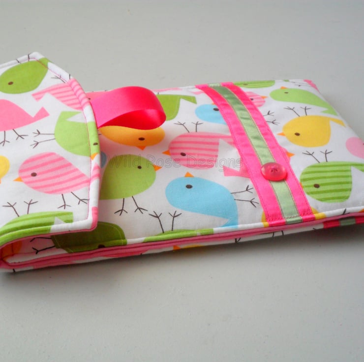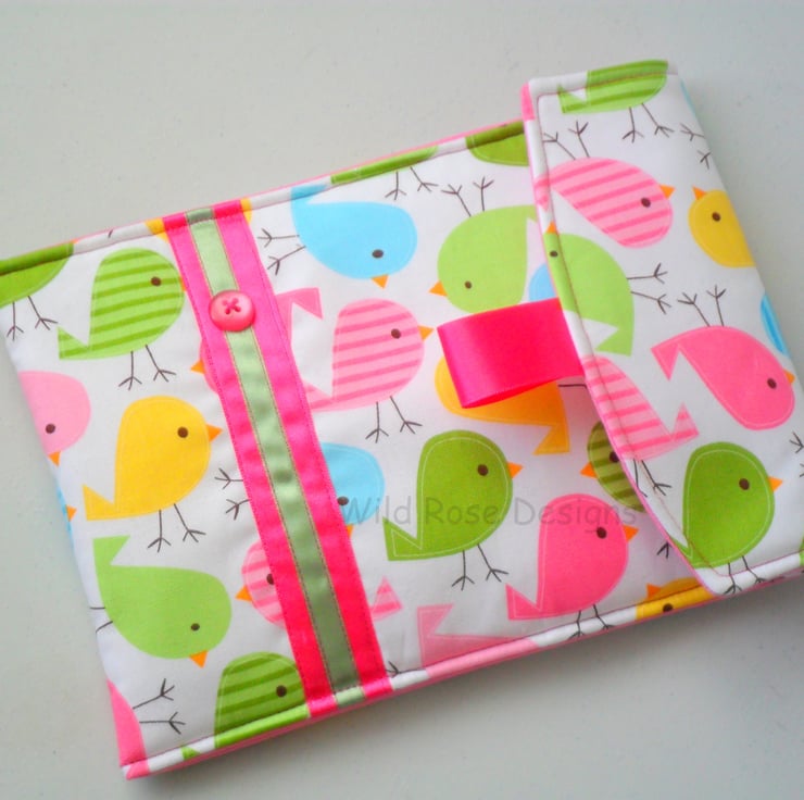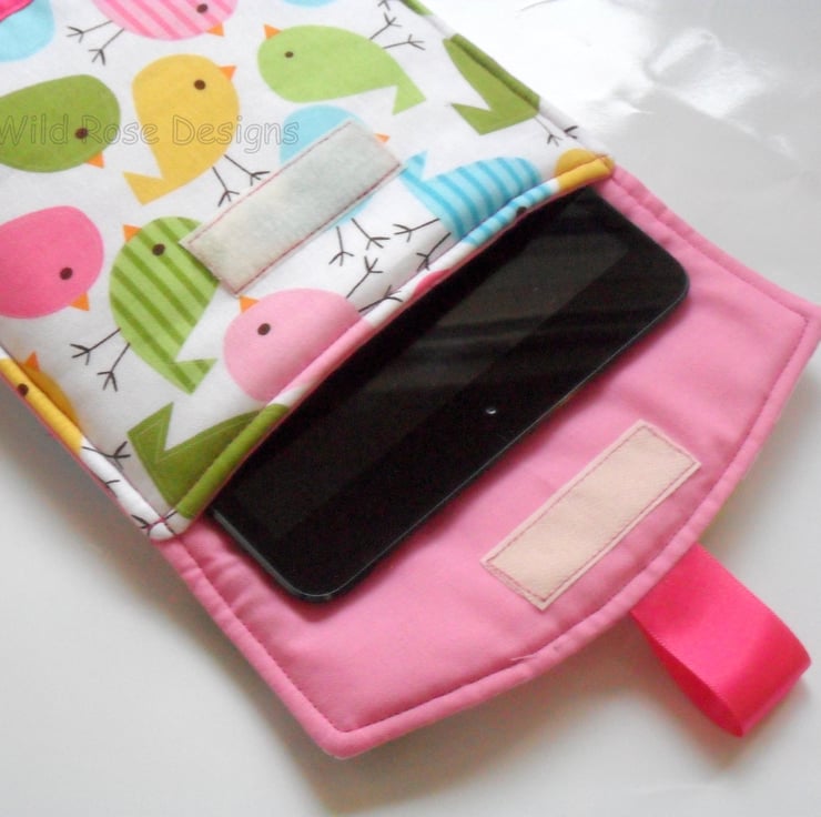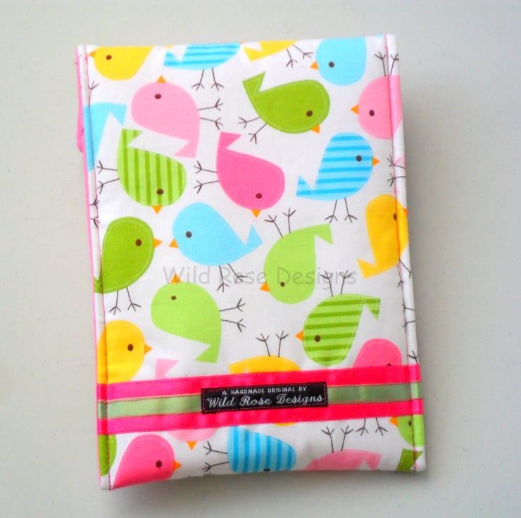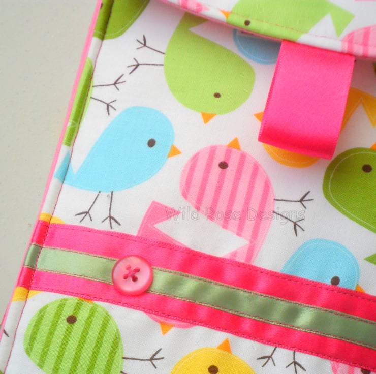 A fun handmade iPad Mini cover in a cute cotton print fabric featuring differently coloured birds. The cover is trimmed with pink and green satin ribbons and finished with a pink button. It is lined in a plain pink cotton, and the flap, which has a pink satin ribbon tab, closes with a Velcro strip.
