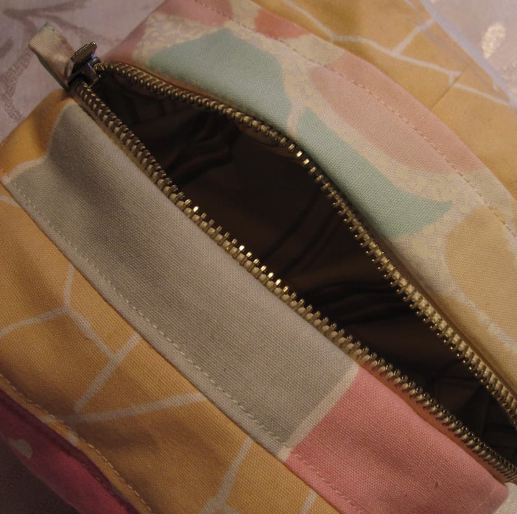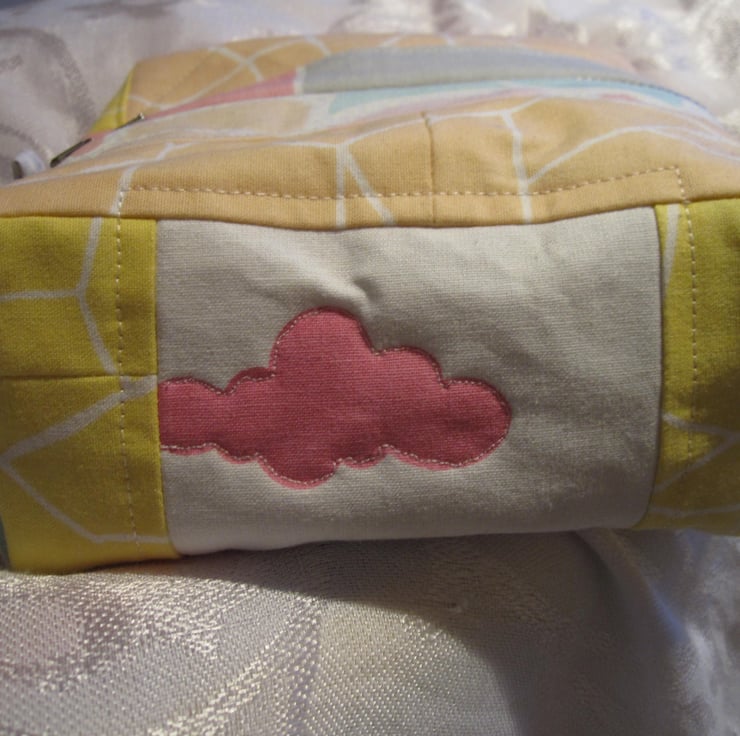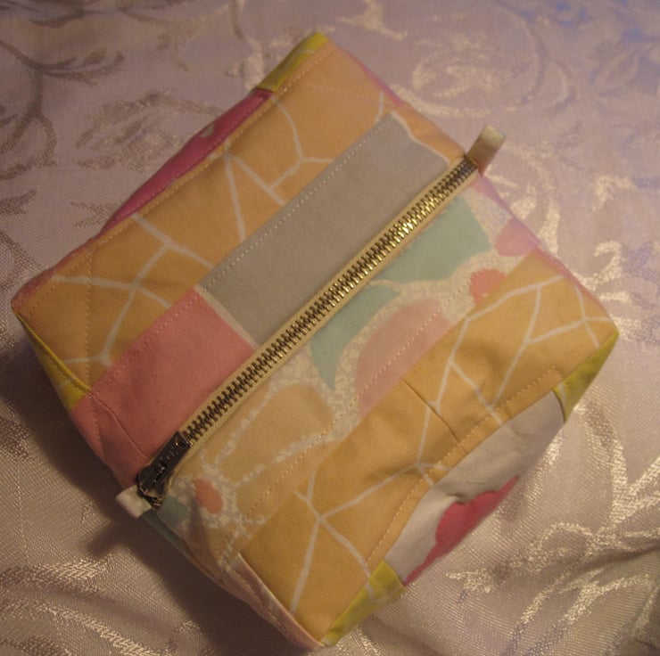 Large, boxy, pretty, quilted make up bag in pastel shades, perfect for all those cosmetics. It could also be used for storing craft items, scissors, yarn, etc. Zip closure and fully lined. 15cm x 15cm x 7cm.