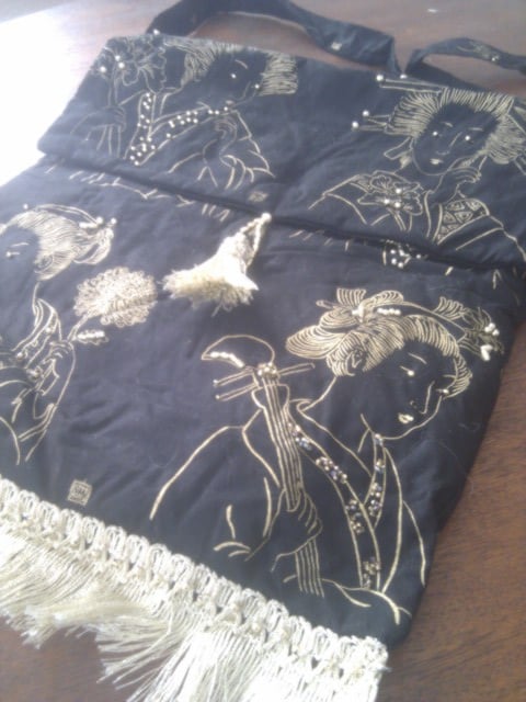 Handmade pretty black geisha gold coloured pattern print cotton bag. Bag has a gold tassel close and white trim on the bottom of the bag with a shoulder strap. Bag is lined, padded and has beading on it.